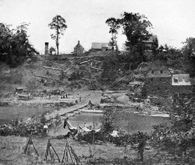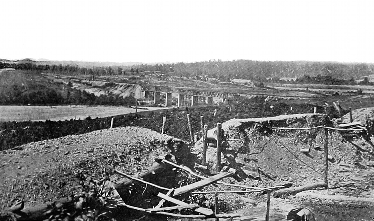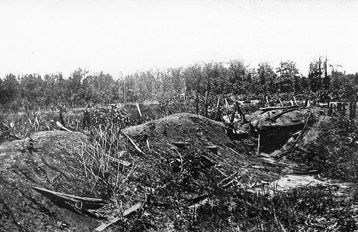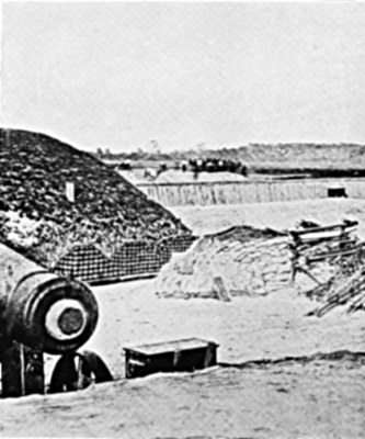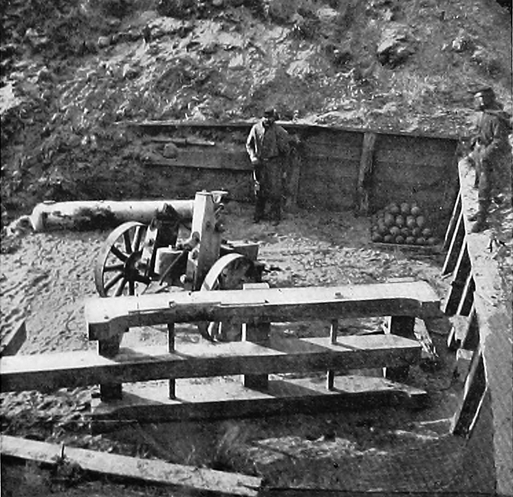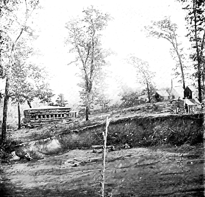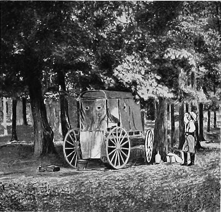 "THE black art," by which Brady secured these photographs, was as mystifying as the work of a magician. It required a knowledge of chemistry and, considering the difficulties, one wonders how Brady had courage to undertake it on the battle-field. He first immersed eighty grains of cotton-wool in a mixture of one ounce each of nitric and sulphuric acids for fifteen seconds, washing them in running water. The pyroxylin was dissolved in a mixture of equal parts of sulphuric ether and absolute alcohol. This solution gave him the ordinary collodion to which he added iodide of potassium and a little potassium bromide. He then poured the iodized collodion on a clean piece of sheet glass and allowed two or three minutes for the film to set. The coated plate was taken into a "dark room," which Brady carried with him, and immersed for about a minute in a bath of thirty grains of silver nitrate to every ounce of water. The plate was now sensitive to white light and must be placed immediately in the camera and exposed and developed within five minutes to get good results, especially in the South during the summer months. It was returned to the dark room at once and developed by pouring over it a mixture of water, one ounce; acetic acid, one dram; pyrogallic acid, three grains, and "fixed" by soaking in a strong solution of hyposulphite of soda or cyanide of potassium. This photograph shows Brady's "dark room" in the Confederate lines southeast of Atlanta, Georgia, shortly before the battle of July 22, 1864. It is a fine example of wet-plate photography.