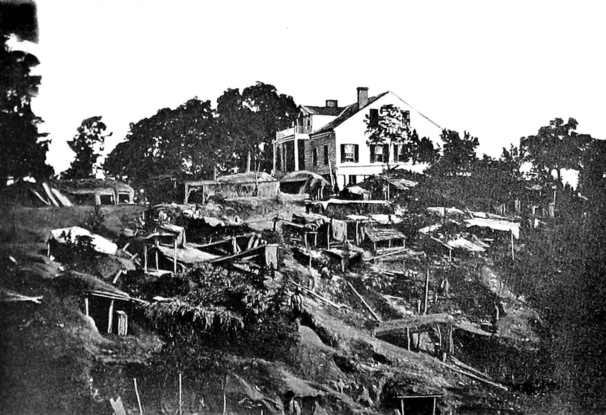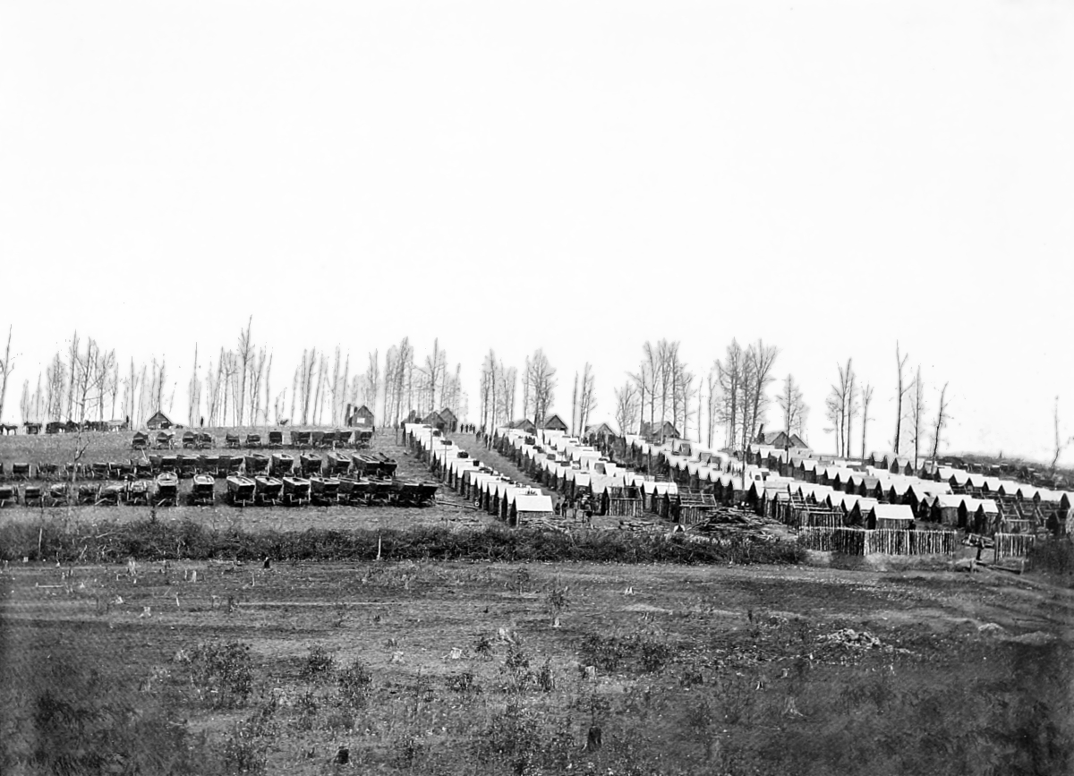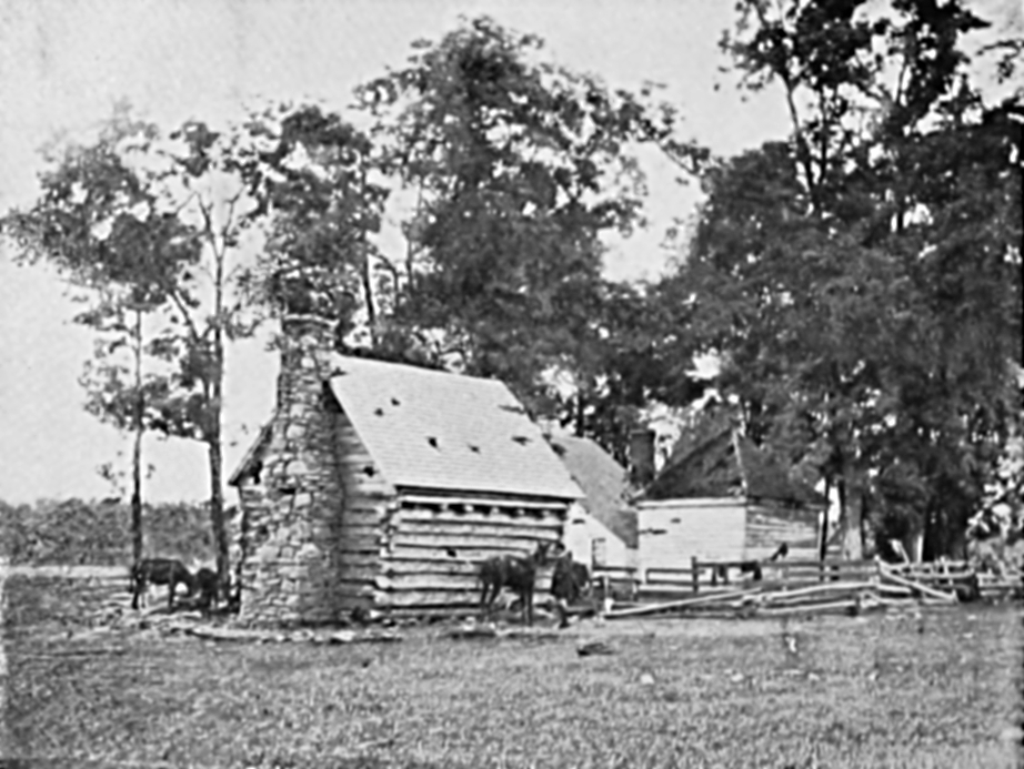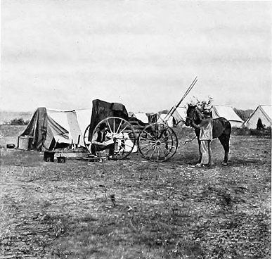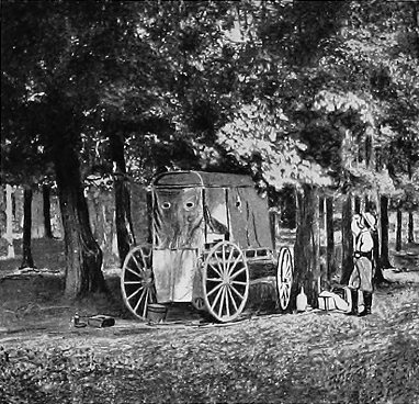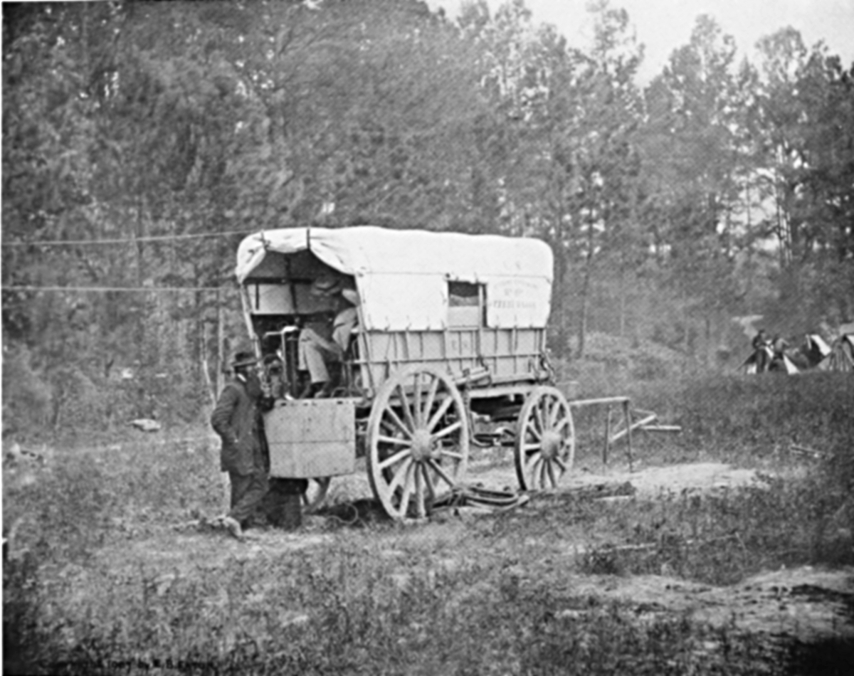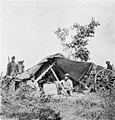 The Photographer's Headquarters at Cold Harbor, Virginia, in 1862, where he had taken refuge to prepare his paraphernalia for a long and hazardous journey—It was with much difficulty that the delicate glass negatives were protected from breakage on these daring rides through forests and fields and proofs were taken at the first opportunity that offered