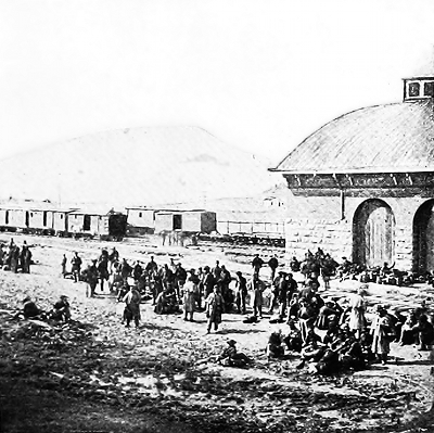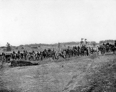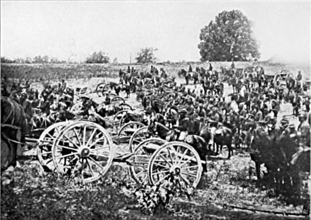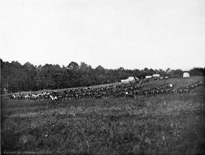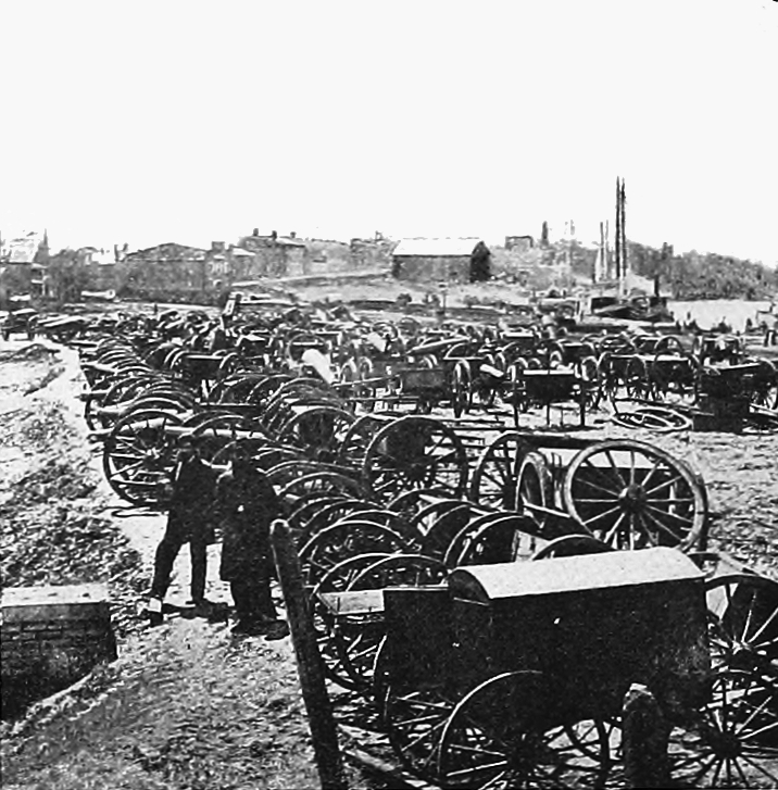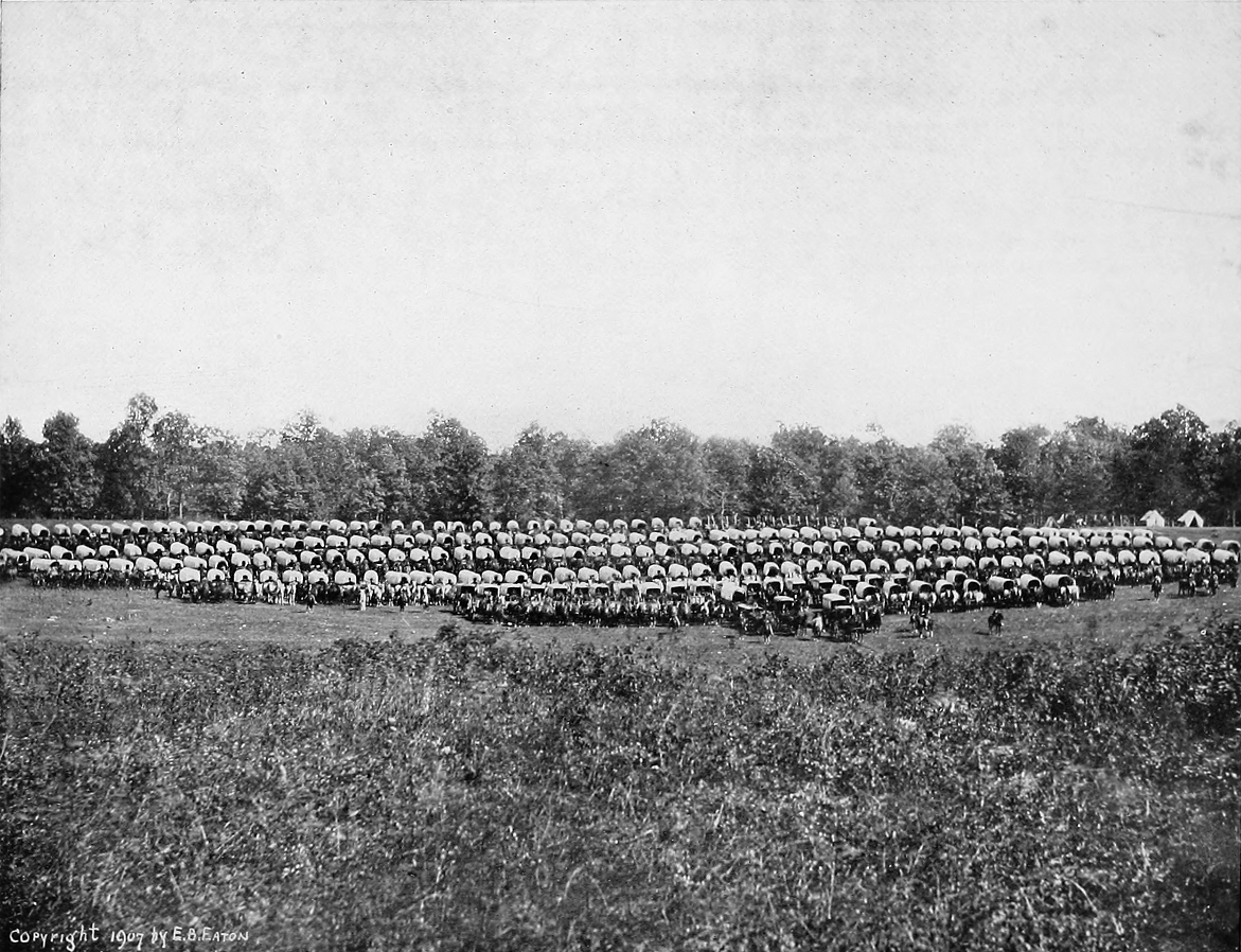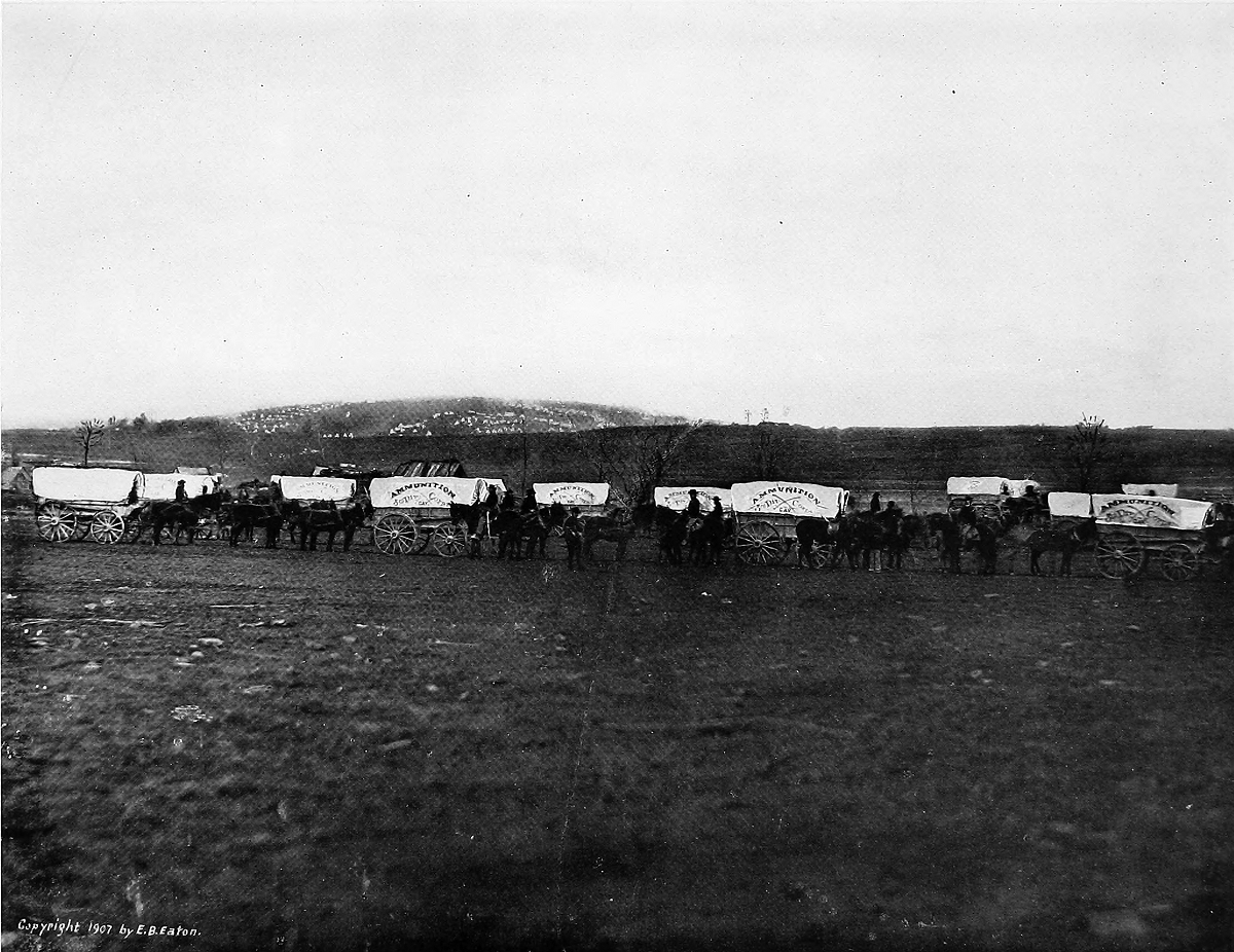 THE lens here perpetuates the interesting spectacle of an army wagon train being "parked" and guarded from a raid by the enemy's cavalry. With a million of the nation's strongest men abandoning production to wage devastation and destruction the problem of providing them with food barely sufficient to sustain life was an almost incalculable enigma. The able-bodied men of the North and the South had turned from the fields and factories to maintain what both conscientiously believed to be their rights. Harvests were left to the elements and the wheels of industry fell into silence. The good women and children at home, aided by men willing but unable to meet the hardships and exposures of warfare, worked heroically to hold their families together and to send to their dear ones at the battle-front whatever comforts came within their humble power. The supply trains of the great armies numbered thousands of six-mule teams and when on the march they would stretch out for many miles. It was in May, in 1863, that one of these wagon trains safely reached Brandy Station, Virginia. Its journey had been one of imminent danger as both armies were in dire need of provisions and the capture of a wagon train was as good fortune as victory in a skirmish. To protect this train from a desperate dash of the Confederate cavalry it was "parked" on the outskirts of a forest that protected it from envious eyes and guarded by the Union lines. One of Mr. Brady's cameras took this photograph during this critical moment. It shows but one division of one corps. As there were three divisions in each corps, and there were many corps in the army, some idea of the immense size of the trains may be gained by this view. The train succeeded in reaching its destination at a time of much need.