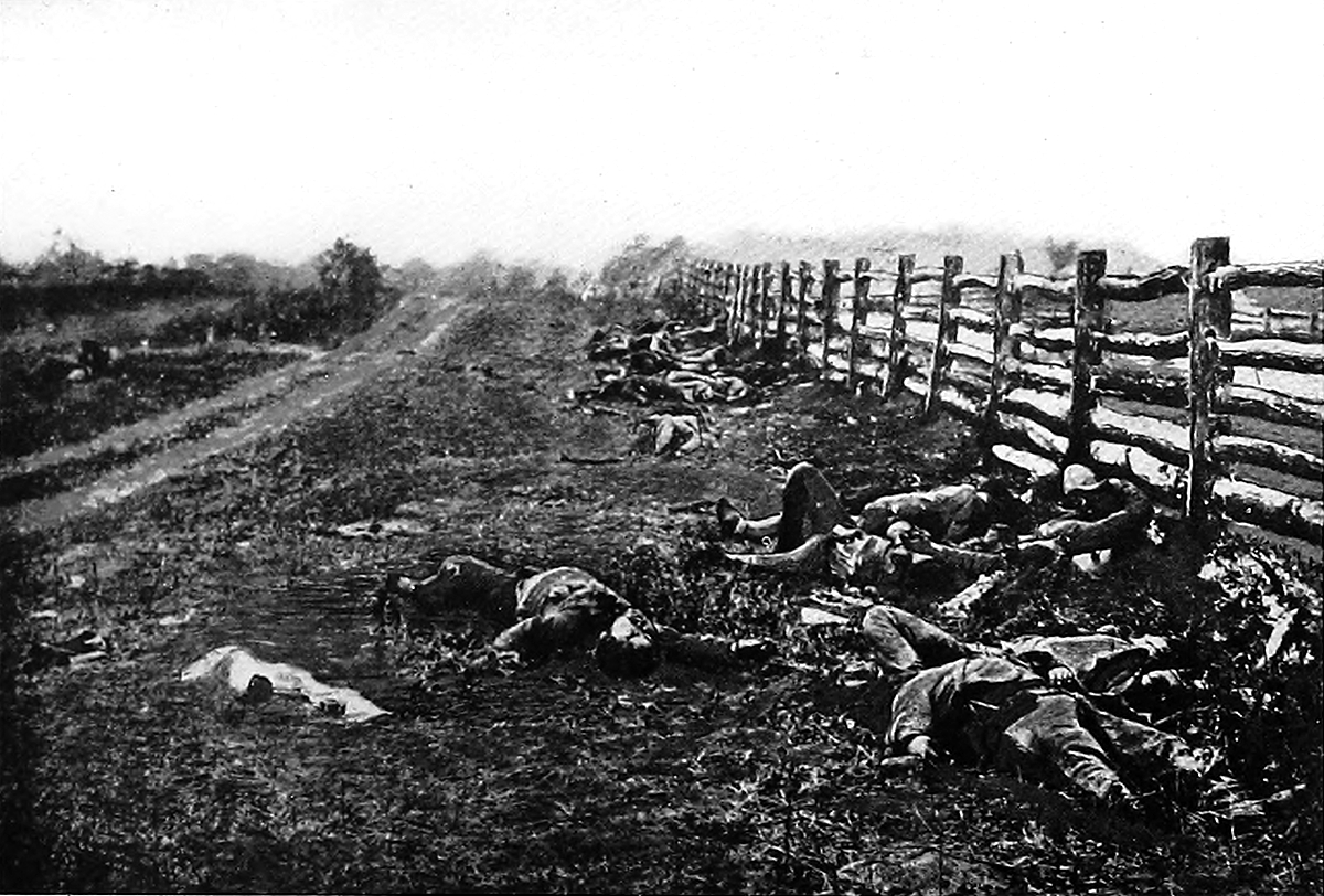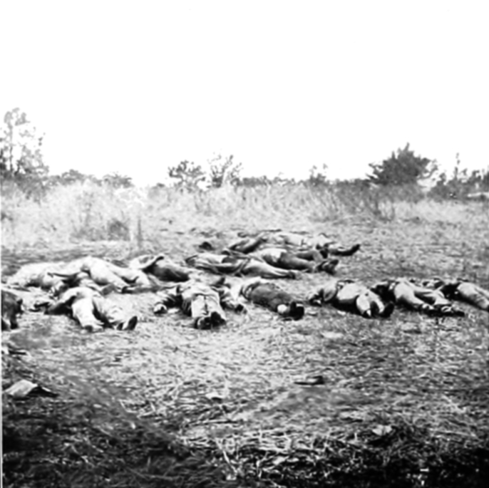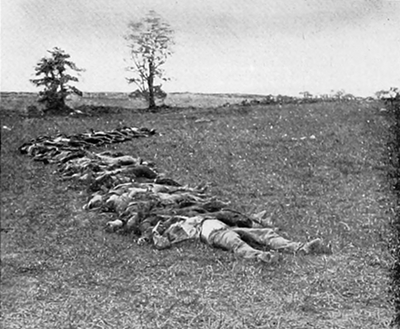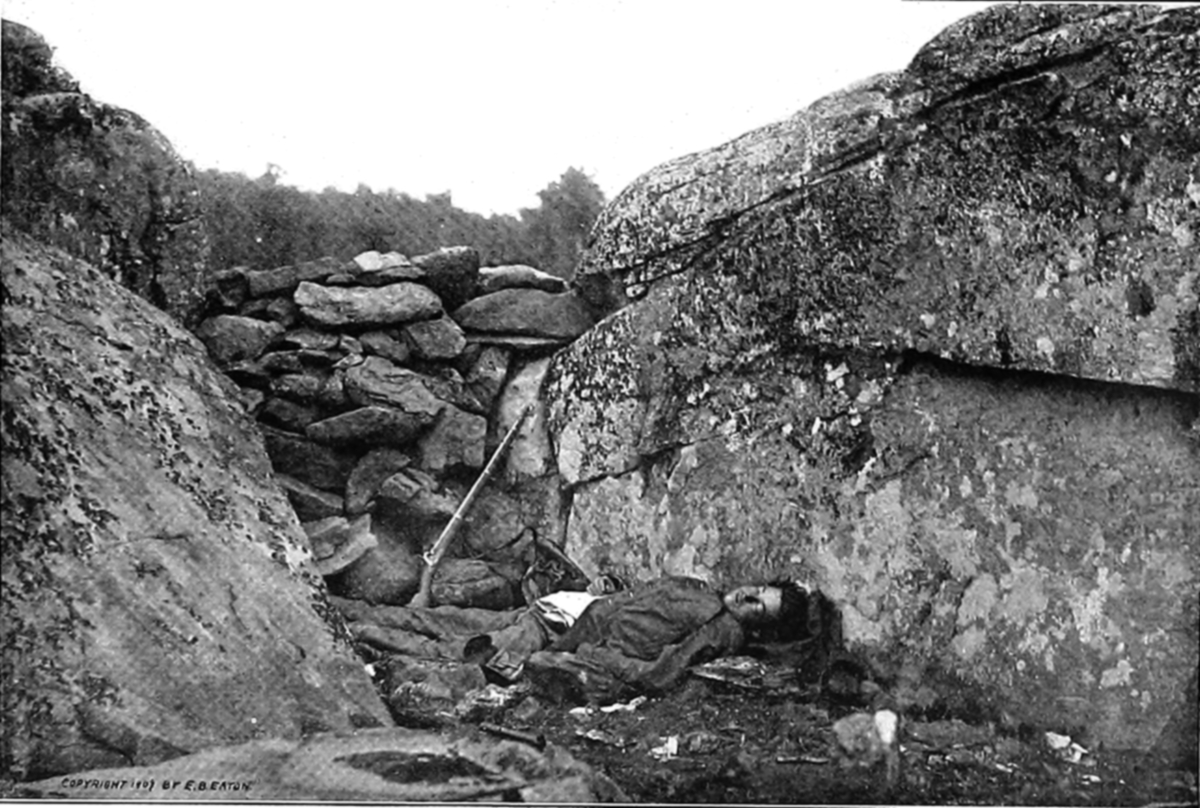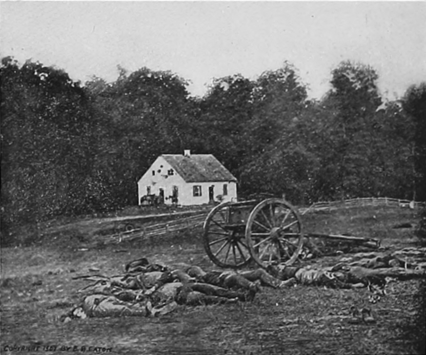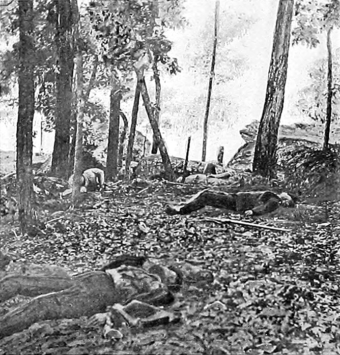 "WAR is hell!" The daring Sherman's familiar truth is here witnessed with all its horrors. War is hell, and this is war! If it were not for the service that this negative should do for the great cause of the world's Peace, this picture, which has lain in a vault in Washington for an epoch, would never be exposed to public view. Its very gruesomeness is a plea to men to lay down arms. Its ghastliness is an admonition to the coming generations. It is a silent prayer for universal brotherhood. The negative was taken after the third day's battle at Gettysburg. The din of the batteries had died away. The clash of arms had ceased. The tumult of men was hushed. The clouds of smoke had lifted and the morning sun engraved on the glass plate this mute witness of the tragedy that had made history. It was the nation's holiday—the Fourth of July in 1863. The camera was taken into the wheat-field near the extreme left of the Union line. The heroes had been dead about nineteen hours. It will be observed that their bodies are already much bloated by exposure to the sun. These men were killed on July 3, 1863, by one discharge of "canister" from a Confederate cannon which they were attempting to capture. Tin cans were filled with small balls about the size of marbles and when the cannon was fired the force of the discharge burst open the can, and the shower of canister balls swept everything before it. When this photograph was taken a detail had already passed over the field, and gathered the guns and accoutrements of the dead and wounded. Shoes, cartridge belts and canteens have been removed from these dead heroes as it was frequently necessary to appropriate them to relieve the needs of the living soldiers. From diamond at extreme right of picture these men are identified as belonging to the second division of third army corps.