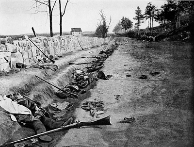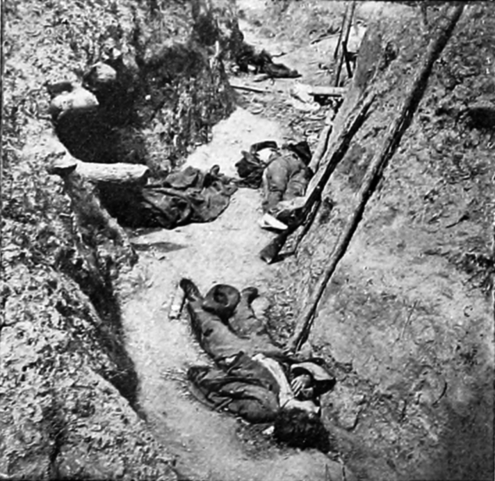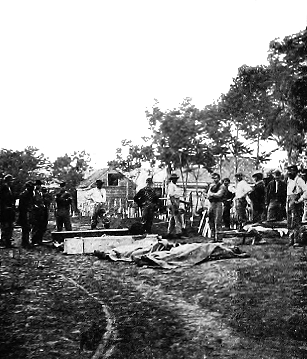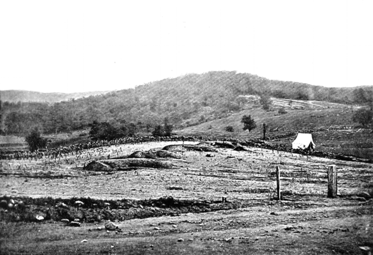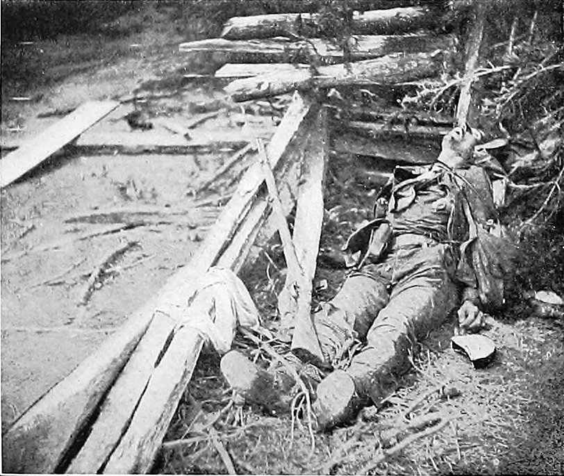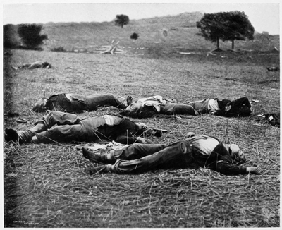 "WAR is hell!" The daring Sherman's familiar truth is here witnessed with all its horrors. War is hell, and this is war! If it were not for the service that this negative should do for the great cause of the world's Peace, this picture, which has lain in a vault in Washington for an epoch, would never be exposed to public view. Its very gruesomeness is a plea to men to lay down arms. Its ghastliness is an admonition to the coming generations. It is a silent prayer for universal brotherhood. The negative was taken after the third day's battle at Gettysburg. The din of the batteries had died away. The clash of arms had ceased. The tumult of men was hushed. The clouds of smoke had lifted and the morning sun engraved on the glass plate this mute witness of the tragedy that had made history. It was the nation's holiday—the Fourth of July in 1863. The camera was taken into the wheat-field near the extreme left of the Union line. The heroes had been dead about nineteen hours. It will be observed that their bodies are already much bloated by exposure to the sun. These men were killed on July 3, 1863, by one discharge of "canister" from a Confederate cannon which they were attempting to capture. Tin cans were filled with small balls about the size of marbles and when the cannon was fired the force of the discharge burst open the can, and the shower of canister balls swept everything before it. When this photograph was taken a detail had already passed over the field, and gathered the guns and accoutrements of the dead and wounded. Shoes, cartridge belts and canteens have been removed from these dead heroes as it was frequently necessary to appropriate them to relieve the needs of the living soldiers. From diamond at extreme right of picture these men are identified as belonging to the second division of third army corps.