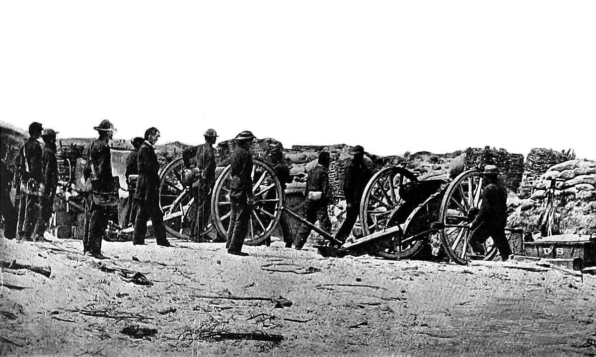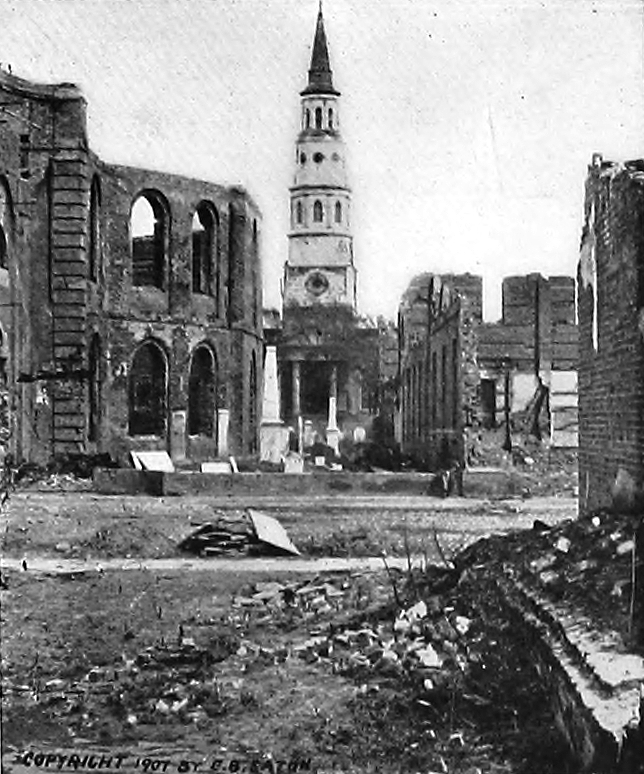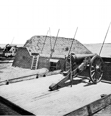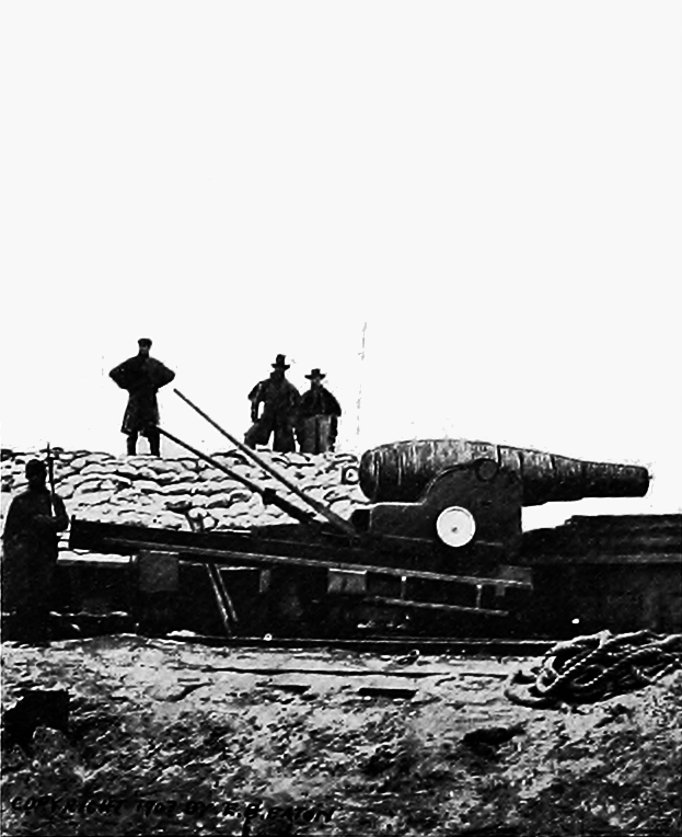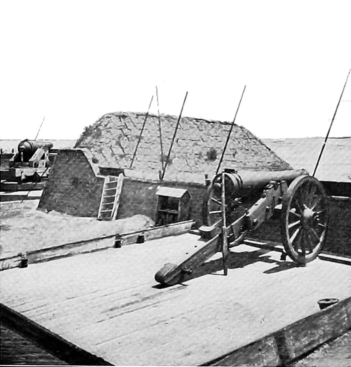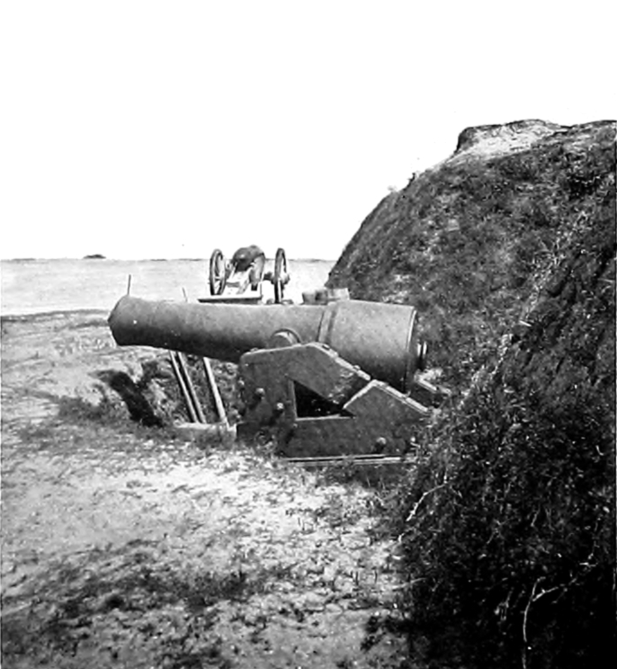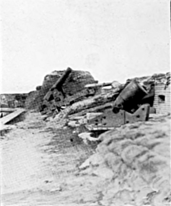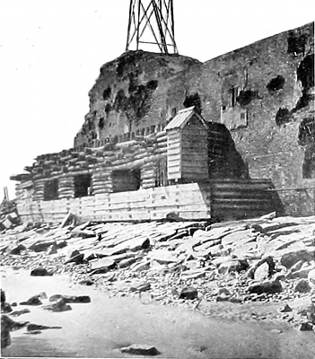 "THEY have fired on Fort Sumter!" These are the words that rang across the continent on the morning of the twelfth of April, in 1861, and the echo was heard around the world. The shot that began one of the fiercest conflicts that civilization has ever seen was fired just before sunrise at four in the morning. Special editions of newspapers heralded the tidings through the land. Thousands of excited men crowded the streets. Trade was suspended. Night and day the people thronged the thoroughfares, eager to hear the latest word from the scene of action. Friday and Saturday were the most anxious days that the American people have ever experienced. When the news came on Sunday morning that Major Robert Anderson had evacuated the fort with flags flying and drums beating "Yankee Doodle," the North was electrified with patriotism. The stars and stripes were thrown to the breeze from spires of churches, windows of residences, railway stations and public buildings. The fife and drum were heard in the streets. Recruiting offices were opened on public squares. Men left their business and stepped into the ranks. A few days later, when the brave defenders of Fort Sumter reached New York, the air was alive with floating banners. Flowers, fruits and delicacies were showered upon the one hundred and twenty-nine courageous men who had so gallantly withstood the onslaught of six thousand. Crowds seized the heroes and carried them through the streets on their shoulders. The South was mad with victory. It was believed that its independence had been already gained. Several days after the bombardment this picture was secured of the historic fort in South Carolina, about which centered the beginning of a great war. It was taken in four sections and this is a panoramic view of them all. The photograph did not fall into the possession of the Government, but was held for many years by a Confederate naval officer, Daniel Ellis, commander of the twenty-gun ram "Chicora" and at one time in command of Fort Sumter. It is now in possession of James W. Eldridge of Hartford. It corrects the erroneous impression that the fort was demolished in 1861. It stood the bombardment with but slight damage, other than a few holes knocked in the masonry as this picture testifies. In saluting the American flag before the evacuation on April 15, Private Daniel Hough was killed and three men wounded by the premature explosion of one of their own guns.