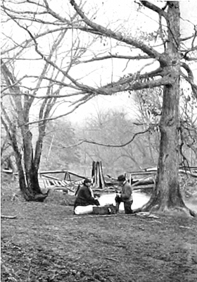 SECRET SERVICE GUIDE DIRECTING BRADY TO SCENE OF ACTION—Pointing toward the edge of the woods where General Reynolds was killed at Gettysburg in July, 1863—Brady carried his cameras onto this field