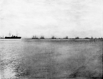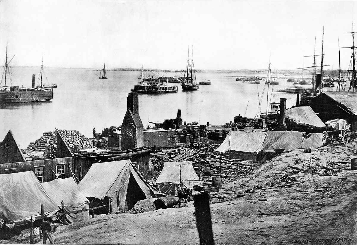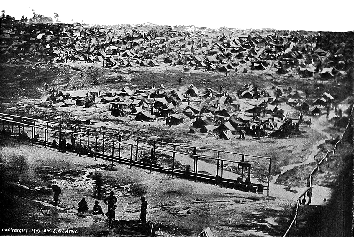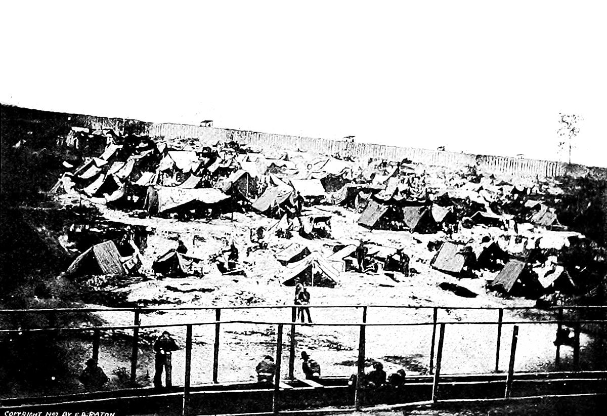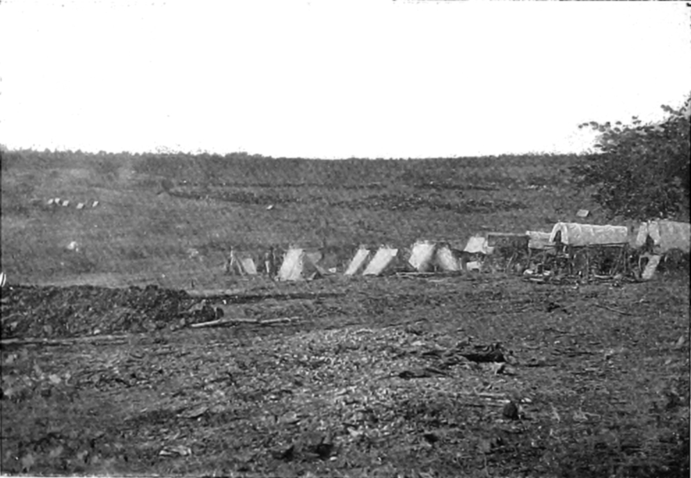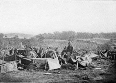 THIS photograph is selected from the seven thousand negatives left by Mathew B. Brady, the celebrated government photographer, as one of the most valuable in existence. It seems to be the first instance on the Western Continent, and possibly in the world, in which a camera successfully imprinted on glass the actual vision of a great army in camp. While scenes such as this are engraved on the memories of the venerable warriors who participated in the terrific struggle this remarkable negative preserves for all ages the magnificent pageant of men, who have offered their lives in defense of their country, waiting for the call to the battle-line. The photograph was taken on a day in the middle of May in 1862 when the Army of the Potomac was encamped at Cumberland Landing on the Pamunky River. A hundred thousand men rested in this city of tents, in the seclusion of the hills, eager to strike a blow for the flag they loved, yet such was the tragic stillness that one who recalls it says that absolute quiet reigned throughout the vast concourse like the peace of the Sabbath-day. On every side were immense fields of wheat, promising an abundant harvest, but trammeled under the feet of the encroaching armies. Occasionally the silence was broken by the strains of a national song that swept from tent to tent as the men smoked and drowsed, fearless of the morrow. The encampment covered many square miles and this picture represents but one brigade on the old Custis place, near White House, which became the estate of General Fitzhugh Lee, the indomitable cavalry leader of the Confederacy and an American patriot during the later war with Spain. The original negative, although now forty-five years old, has required but slight retouching in the background.