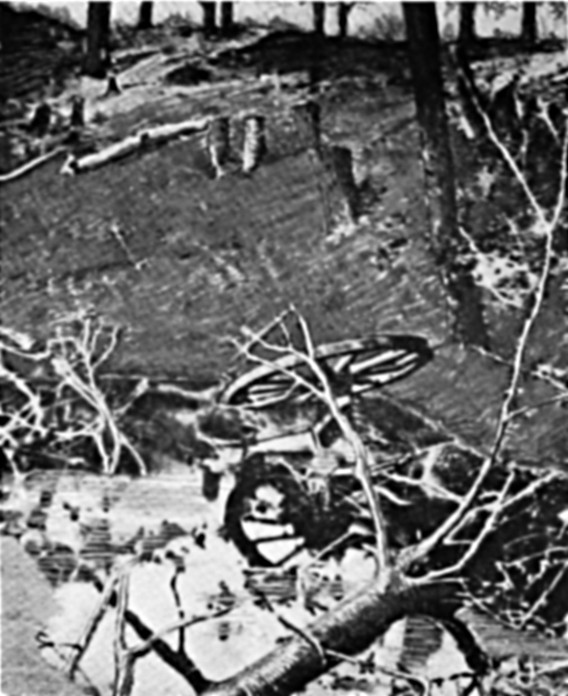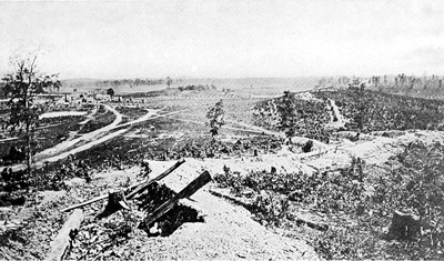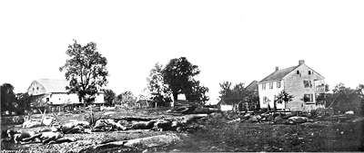 BRADY ON THE BATTLEFIELD OF GETTYSBURG IN JULY 1863—The smoke of the terrific conflict had hardly cleared away when Brady's "What is it" wagon rolled onto the bloody "wheat field"—This picture shows Brady looking toward McPherson's woods on the left of the Chambersburg Pike at the point near which the Battle of Gettysburg began
