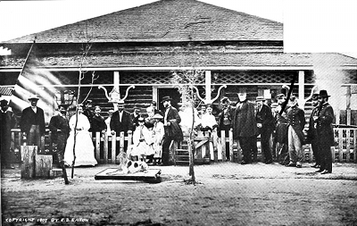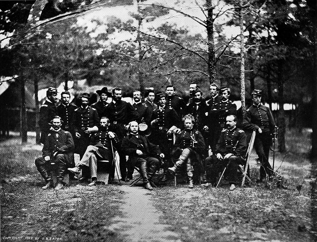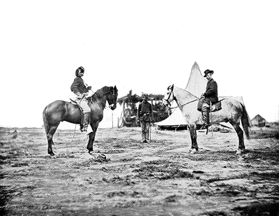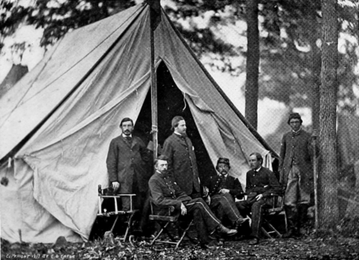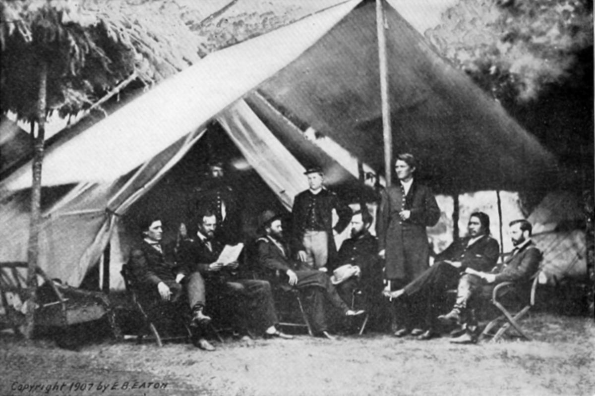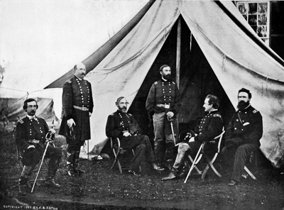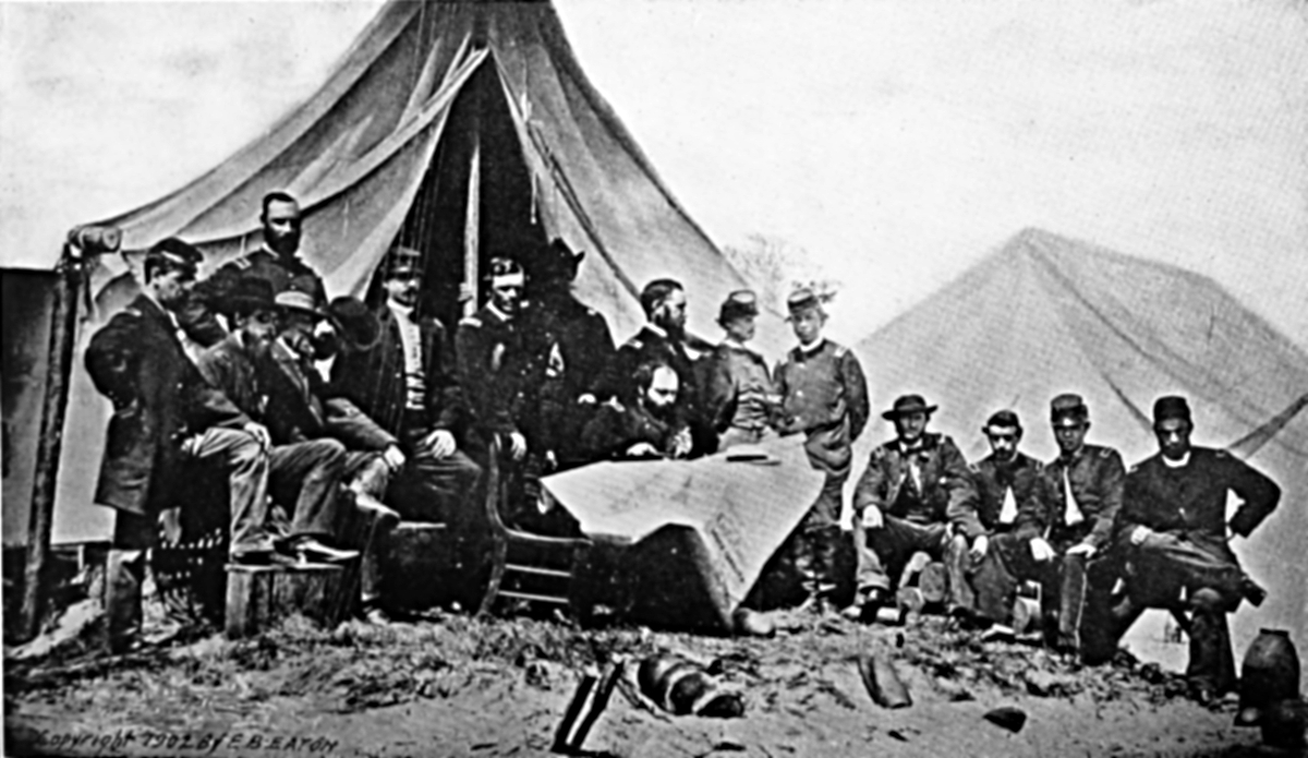 He followed the Armies during the Civil War and secured these remarkable Negatives—In conference with Major-General Burnside at the Headquarters of the Army of the Potomac near Richmond, Virginia—Brady occupies the chair directly in front of the tree while General Burnside is reading a newspaper—This picture was found amoSng his negatives