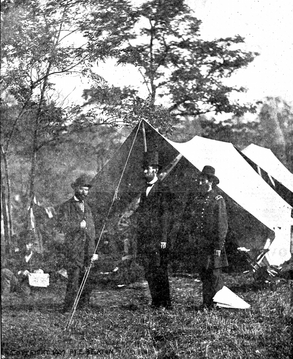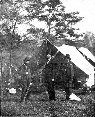 THE REMARKABLE PHOTOGRAPH WAS TAKEN AT ANTIETAM IN OCTOBER, 1862, AND SHOWS PRESIDENT LINCOLN IN CENTER, MAJ. ALLAN PINKERTON ON LEFT AND GEN. JOHN A. McCLERNAND ON RIGHT.