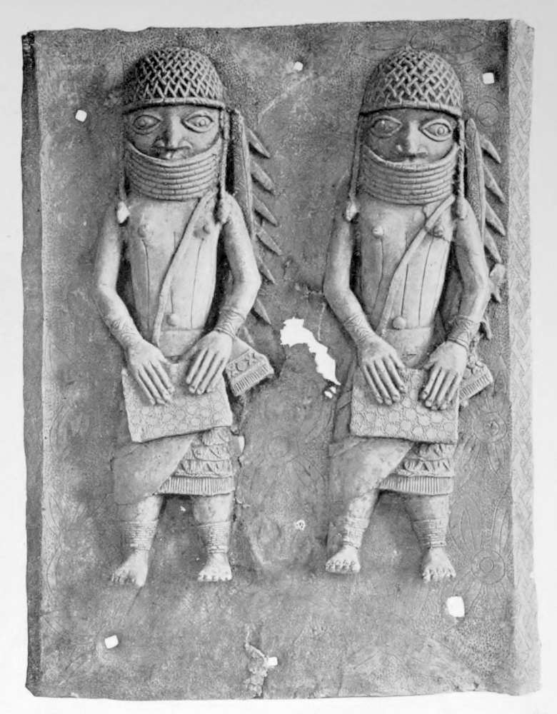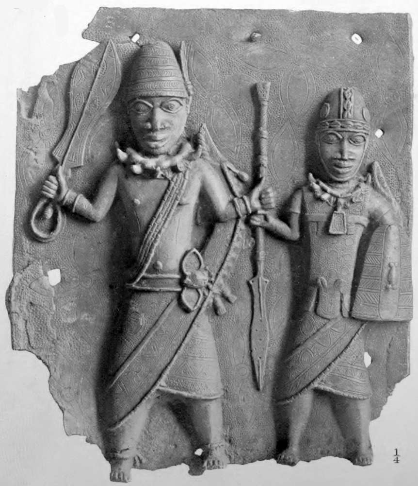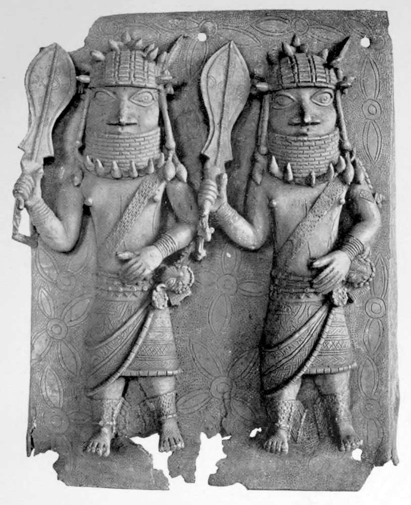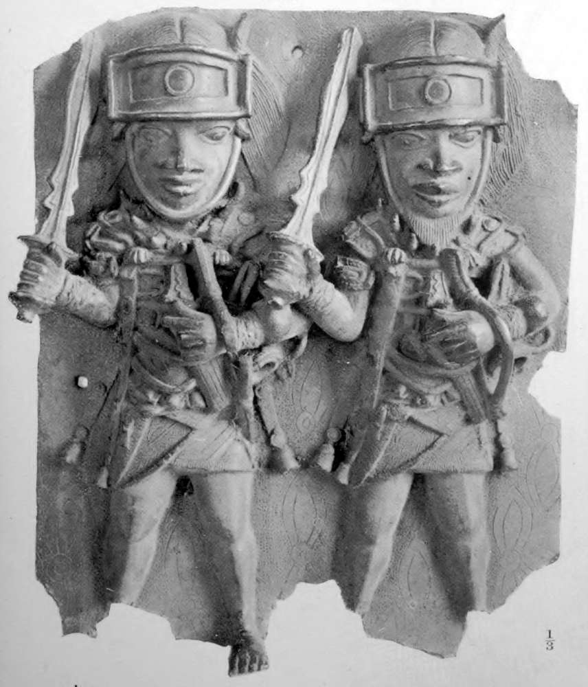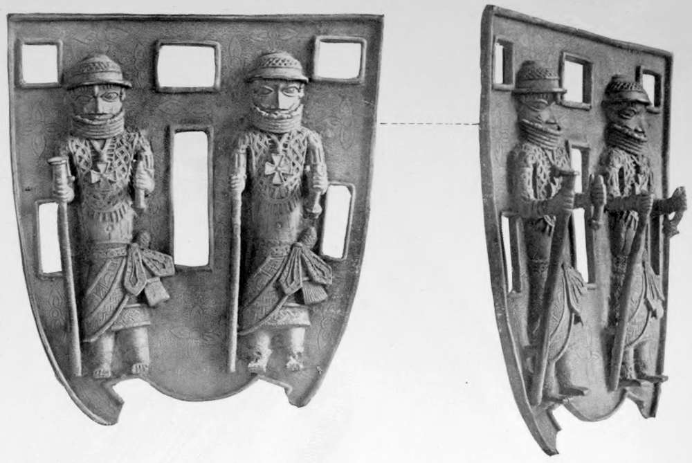 Fig. 1.—Bronze plaque, representing two warriors with broad leaf-shaped swords in their right hands. Coral or agate head-dress. Coral chokers, badge of rank. Leopards’ teeth necklace. Coral scarf across shoulder. Leopards’ heads hanging on left sides. Skirts each ornamented with a human head. Armlets, anklets, etc. Ground ornamented with the usual foil ornament incised.