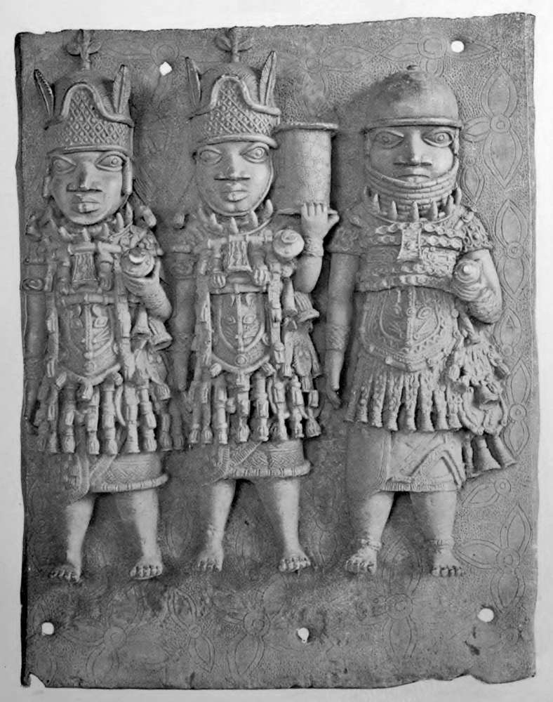 Fig. 3.—Bronze plaque, representing three warriors, two with feathers in head-dress and trefoil leaves at top; one with pot helmet, button on top. The latter has a coral choker, badge of rank, and all have leopards’ teeth necklaces. The central figure has a cylindrical case on shoulder. Two have hands on their sword-hilts. All three have leopards’ heads on breast, and quadrangular bells hanging from neck. Leopards’ skins and other objects hang on left sides. Ground ornamented with foil ornaments incised.