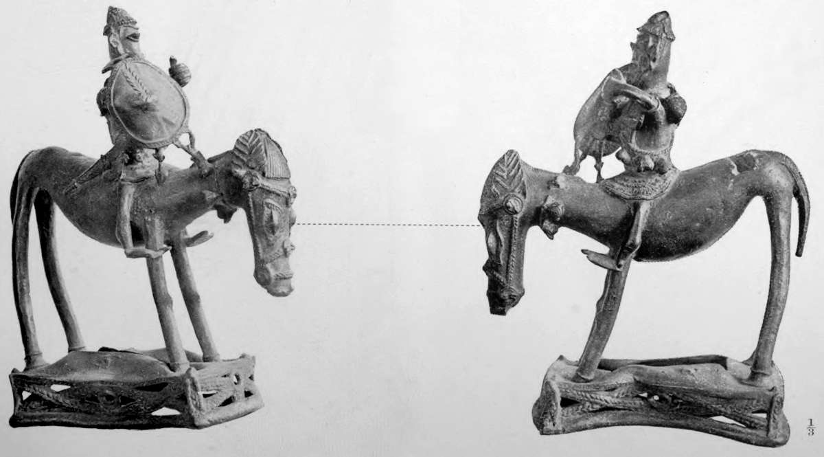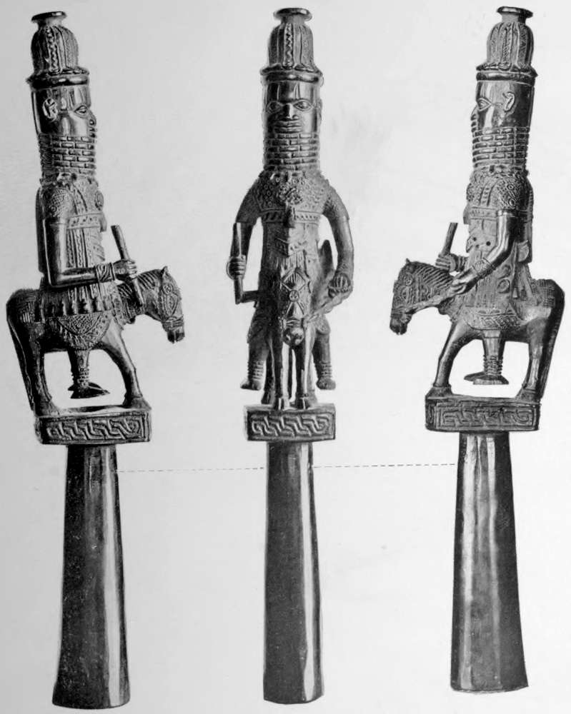 Figs. 79 to 81.—Figure of a warrior on horseback. Spear in right hand, the blade having an ogee corrugated section, similar to those used in all parts of Africa where metal blades are used. The edges of the blade are bent over by rough usage, which makes it look like a spoon. The duct for the metal runs from the head of the horse. Darts in left hand. The ends of the spear and darts are bent inwards, as if by rough usage. The chain halter is similar to those seen on other horses and is used as a bridle, held by the little finger of the left hand. A circular shield, similar to the one in this collection (Plate XVIII, Fig. 102), though differently decorated, is slung on the left side over the thigh. The spurs attached to the legs have four points arranged horizontally. The figure has a leopard’s skin on front and back, ornamented with representations of cowrie shells. The coat and collar bordered with interlaced strap-work. Dagger on right side. Crown, apparently of feathers, on head. Base ornamented with interlaced strap-work or guilloche pattern. The horse is fairly well formed. The hair conventionalized in straight lines. The face is that of a negro.