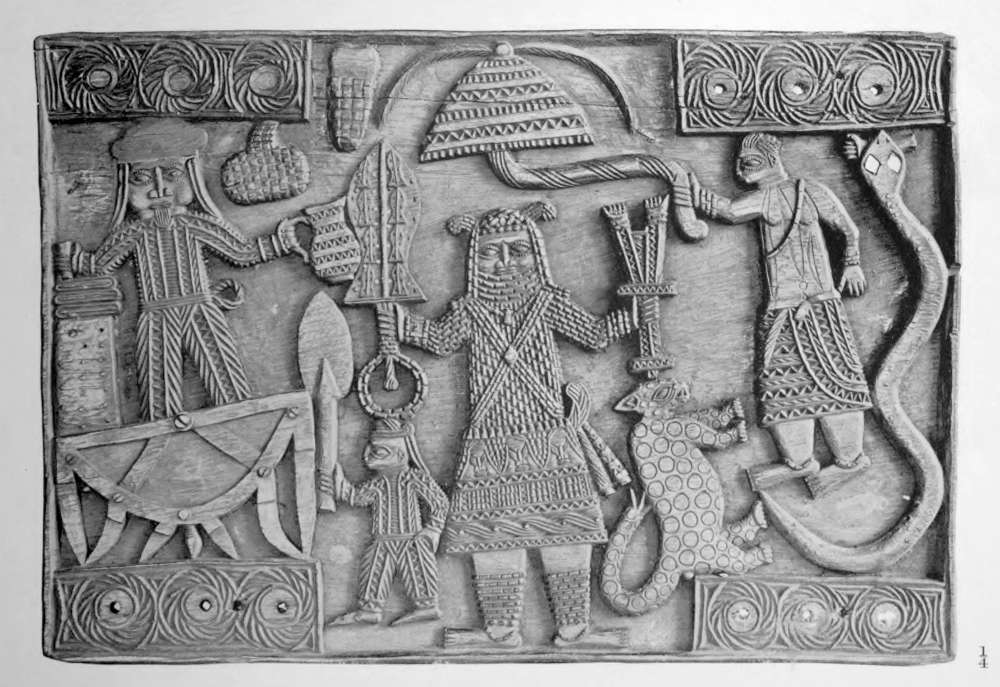 Fig. 27.—Carved wooden panel, consisting of a chief in the centre; broad leaf-shaped sword, with ring attached to pommel, upheld in right hand, studded with copper nails, and ornamented with representations of itself. In left hand a fan-shaped figure terminating in two hands. Coral choker, badge of rank. Bell on neck and cross-belts. Skirt ornamented with three heads and a guilloche pattern of three bands with pellets. Anklets. Attendant on left holding umbrella over chief’s head. Serpent with human arm and hand in its mouth, head upwards; eyes of inlaid glass; body studded with copper nails. Leopard, drawn head upwards. On right, figure with jug in left hand and cup in right hand, standing in a trough or open vessel. Small attendant with paddle in right hand. At top a bottle bound with grass, and figure of some object, perhaps a stone celt bound with grass. Brass and iron screws are used for ornamentation in this carving. Guilloche pattern of two bands without pellets around the edge of the panel.
