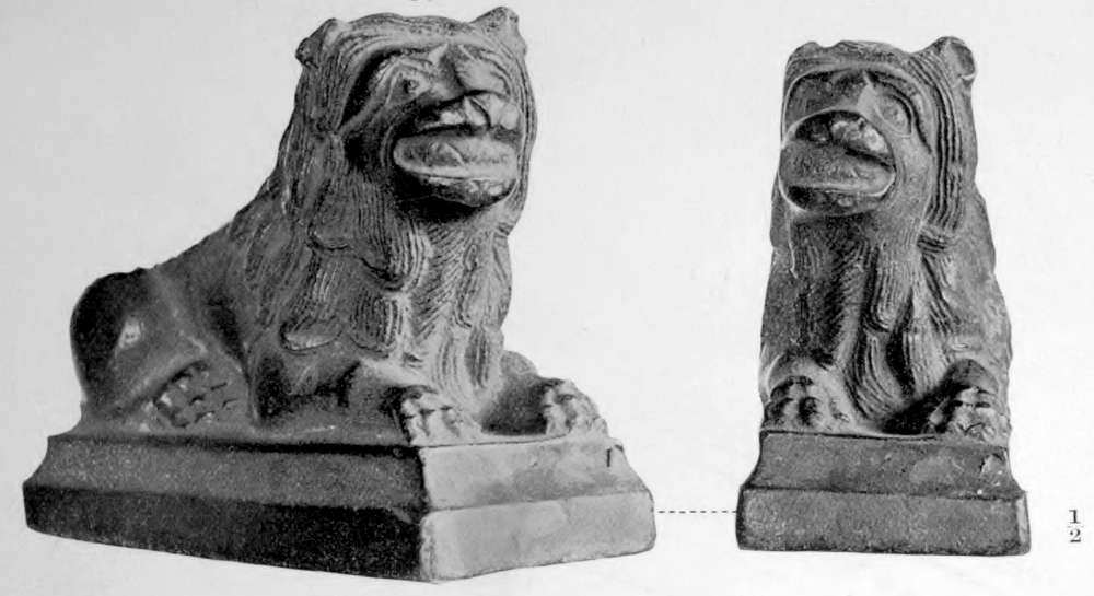 Figs. 35 and 36.—Lion in bronze. The back is cut in a curved line, as if adapting it as a foot to some object.