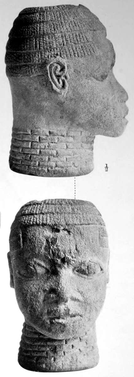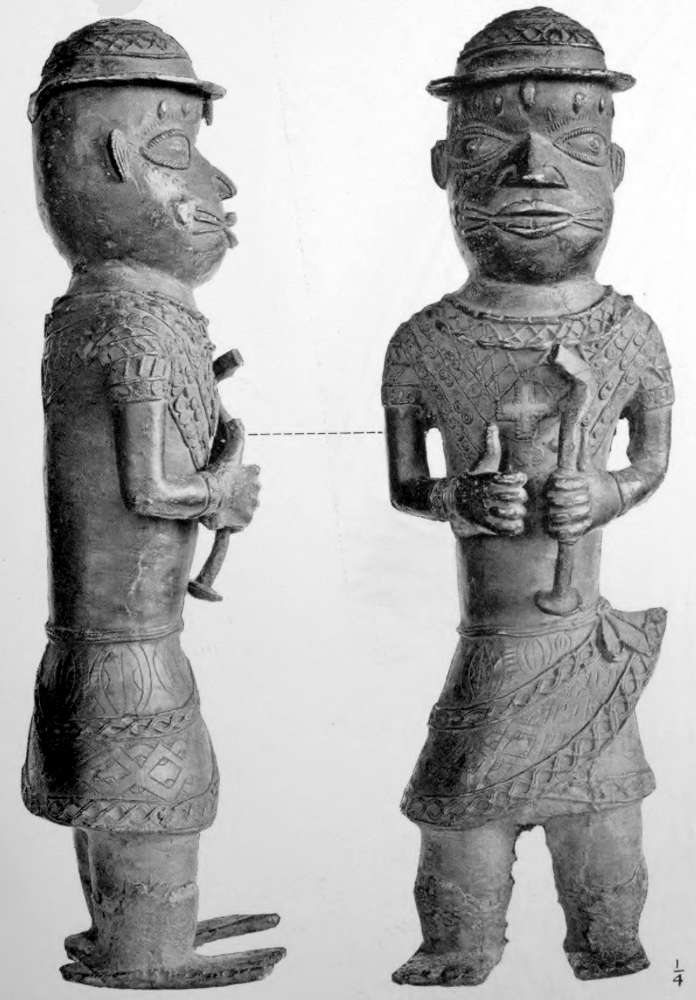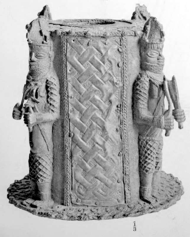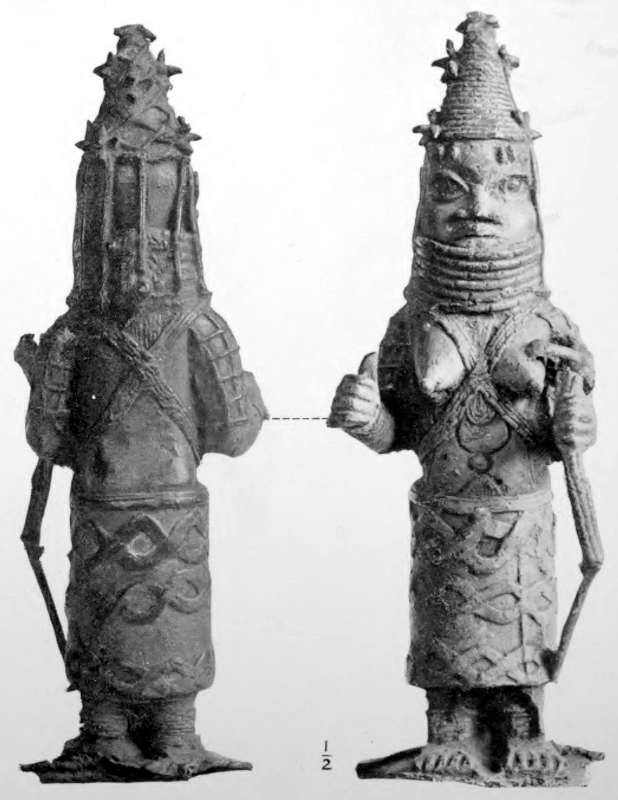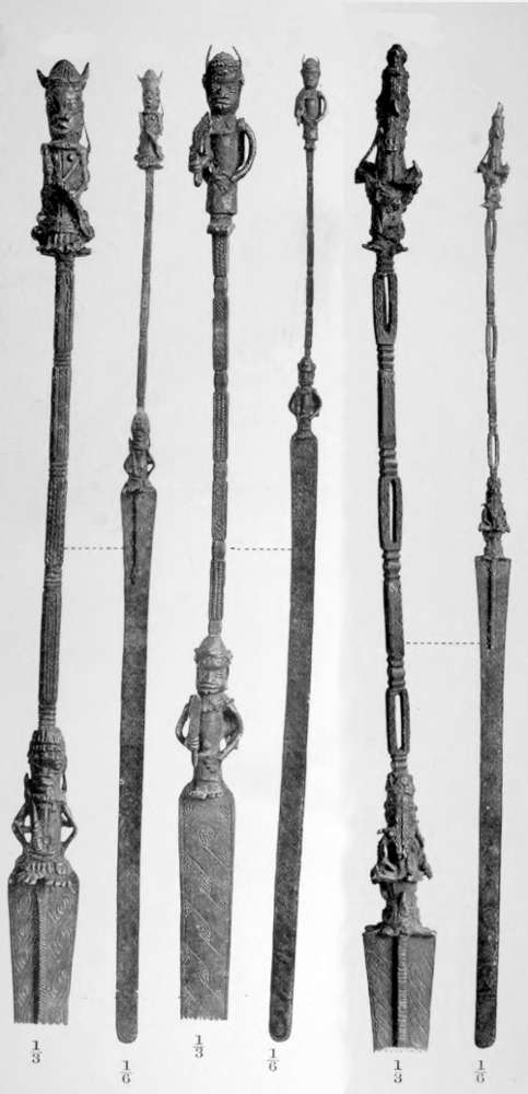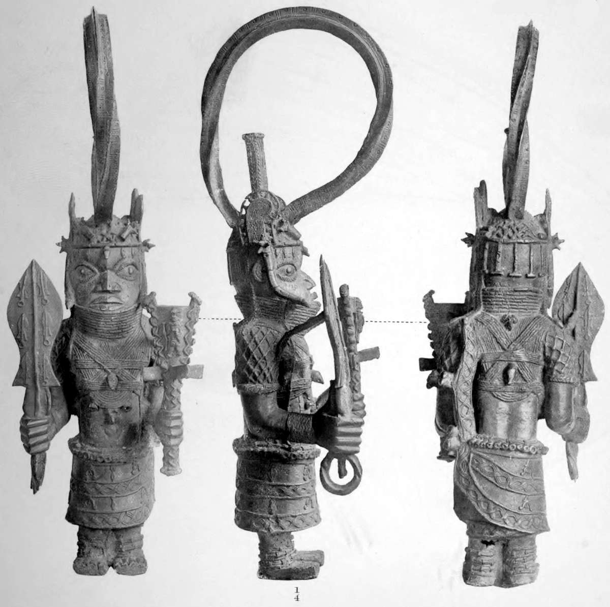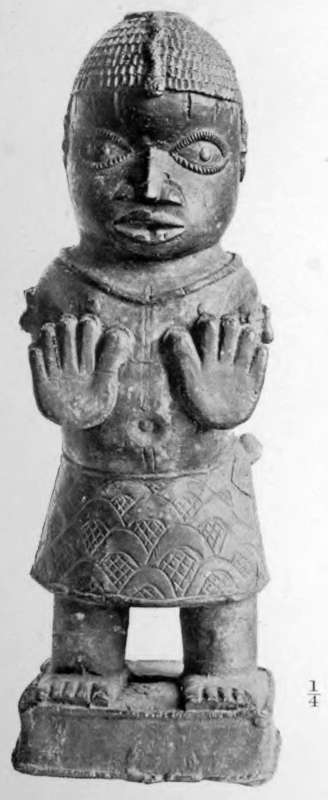 These antiquities were brought away by the members of the punitive expedition and sold in London and elsewhere. Little or no account of them could be given by the natives, and as the expedition was as usual unaccompanied by any scientific explorer charged with the duty of making inquiries upon matters of historic and antiquarian interest, no reliable information about them could be obtained. They were found buried and covered with blood, some of them having been used amongst the apparatus of their Juju sacrifices.