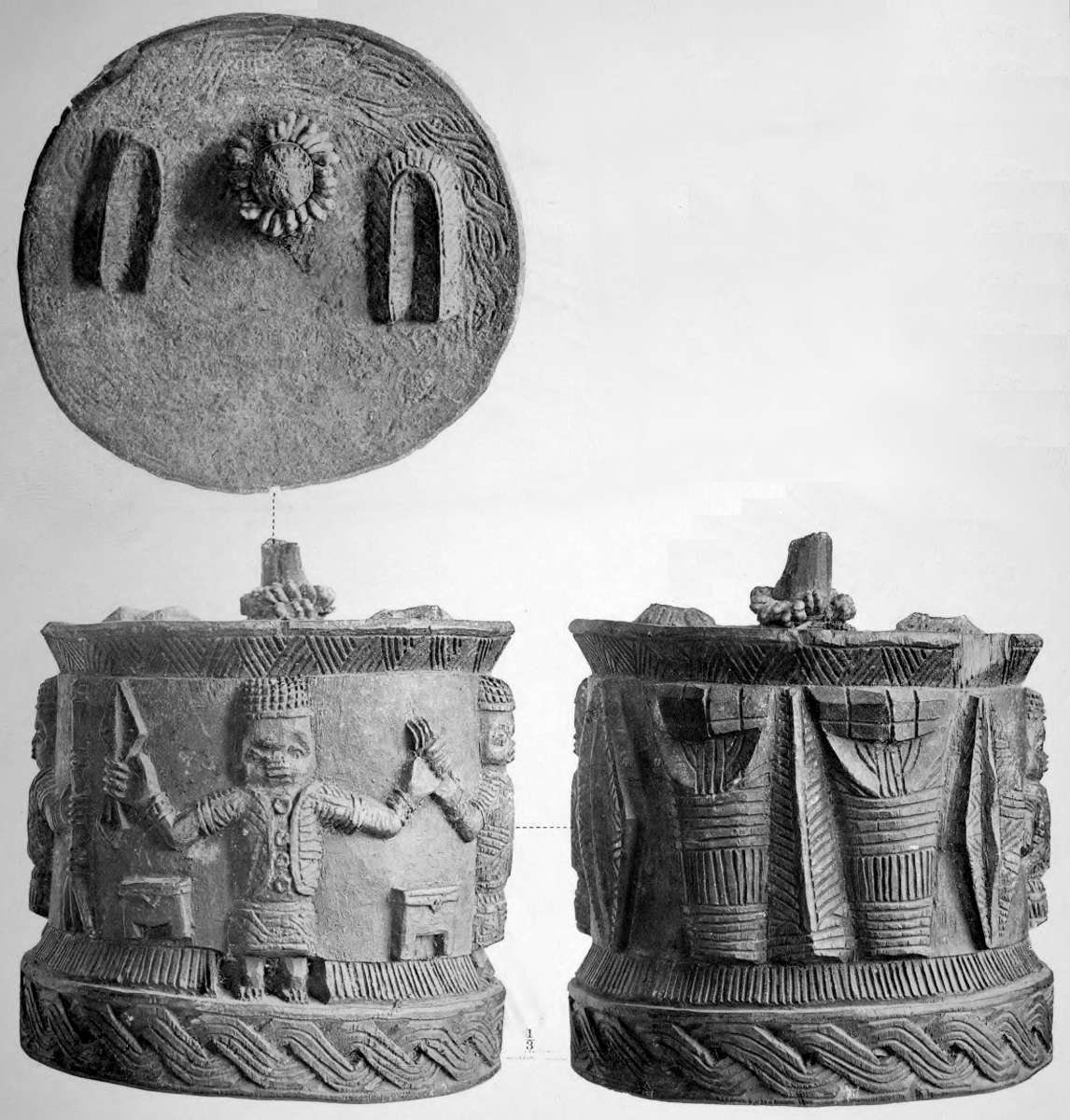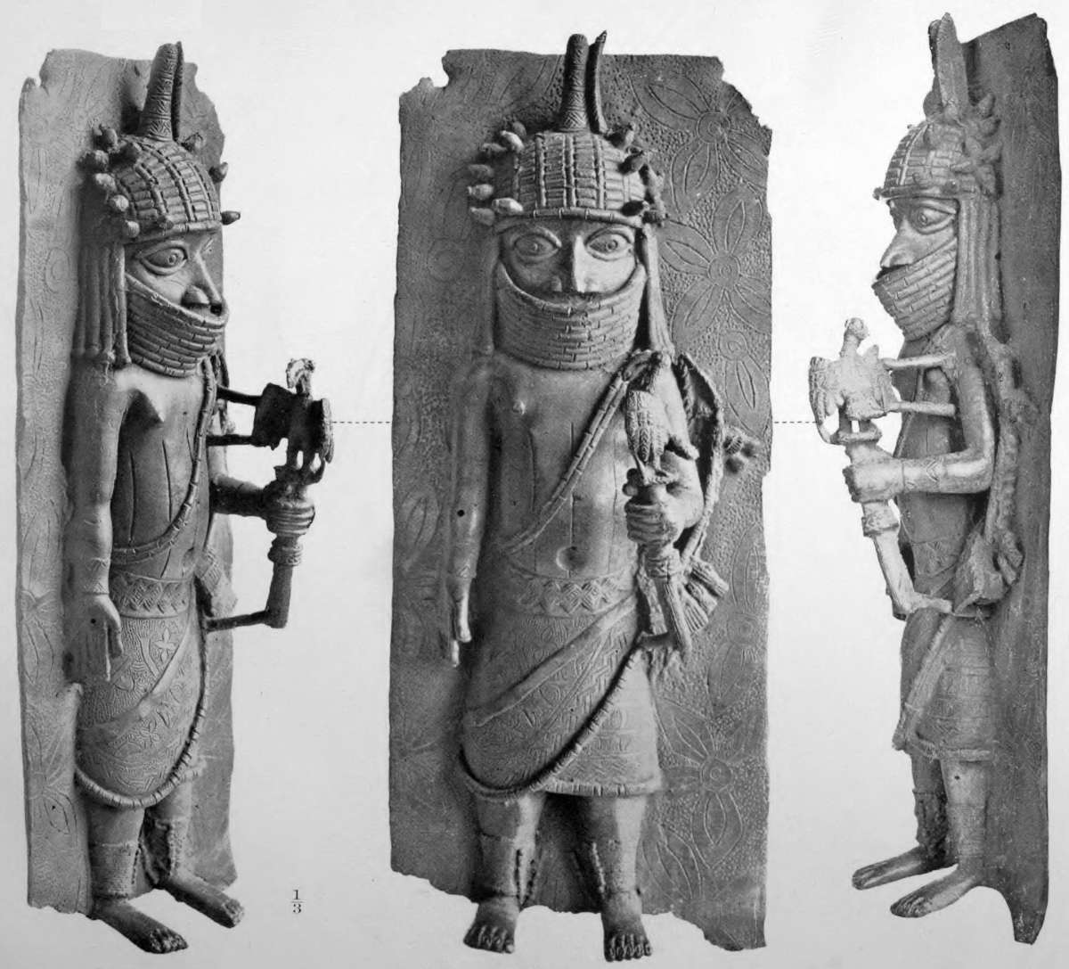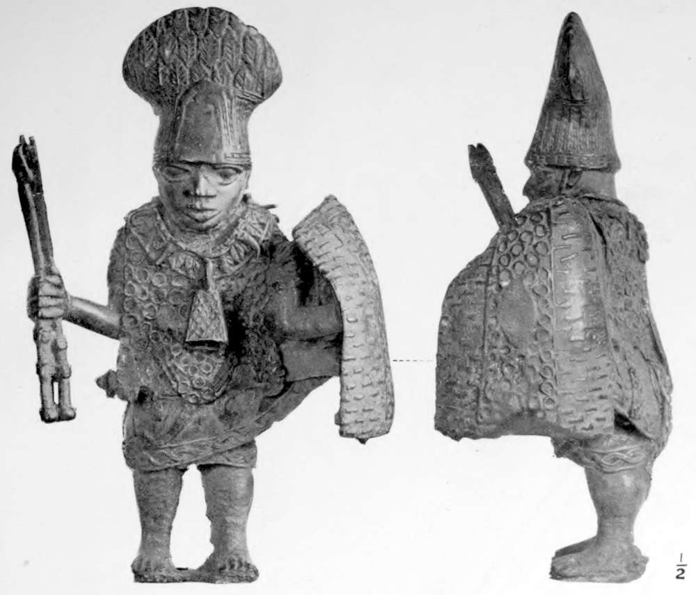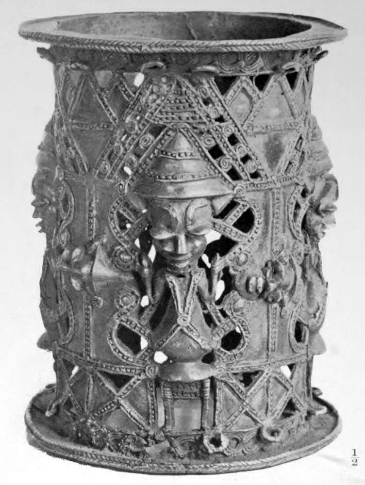 These antiquities were brought away by the members of the punitive expedition and sold in London and elsewhere. Little or no account of them could be given by the natives, and as the expedition was as usual unaccompanied by any scientific explorer charged with the duty of making inquiries upon matters of historic and antiquarian interest, no reliable information about them could be obtained. They were found buried and covered with blood, some of them having been used amongst the apparatus of their Juju sacrifices.