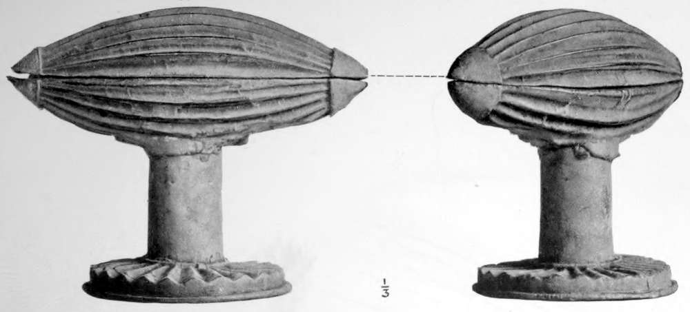 Figs. 51 and 52.—Bronze pointed dish on stand, with ribbed cover, rabbetted. Use unknown; perhaps an European ecclesiastical utensil.