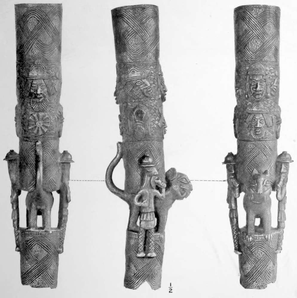 Figs. 66 to 72.—The historic mace of office of Duboar, late King of Benin; 5 feet 4 inches long, and made of brass. This was found by an officer of the expedition in the state apartment of the palaver house, and was evidently left behind by the king’s people on account of its heavy weight, in their hurried exodus from Benin city; the king is said to have since recognized this staff, and stated that it had been handed down for many hundreds of years from king to king. It has the representation of “Overami,” or reigning monarch, on the summit, dressed in the usual manner of Benin warriors. He is standing on an elephant which has a proboscis terminating in a human hand. This peculiarity is represented very often in the bronze antiquities of the Benin country, and especially on the carved tusk, Figs. 167 and 168, Plate XXVI, and must probably represent some great fetish; the present race, on enquiries being made, could not elucidate this matter, so its history must date back many ages. This elephant is in turn supported by the usual two royal leopards. The monarch holds in his right hand his chief ju-ju, which never leaves him night or day; in his left hand he holds a neolithic or stone axe head, edge upwards, which are looked up to by the natives even now with great awe and superstition. The interior of the upper part of the mace is hollow, having a piece of metal inside, formed like a long crotal, and was used as a bell to keep order. The broad leaf-shaped swords and the execution swords are depicted in several places over the mace. It is ornamented with guilloche pattern of two and three bands with intervening pellets. Part of the mace is ornamented in imitation of twine binding. Near the foot of the staff is the figure of another elephant with proboscis terminating in a human hand, holding a plant like a prickly-pear. Beneath the elephant are two human figures, with Maltese crosses on breasts, axes in left hands, and sticks in right. Below this are two axes hafted in serpents’ heads, which have human hands in their mouths and sinuous bodies. Crocodile, head downwards, and two interlaced mud-fish.