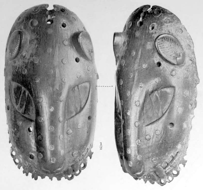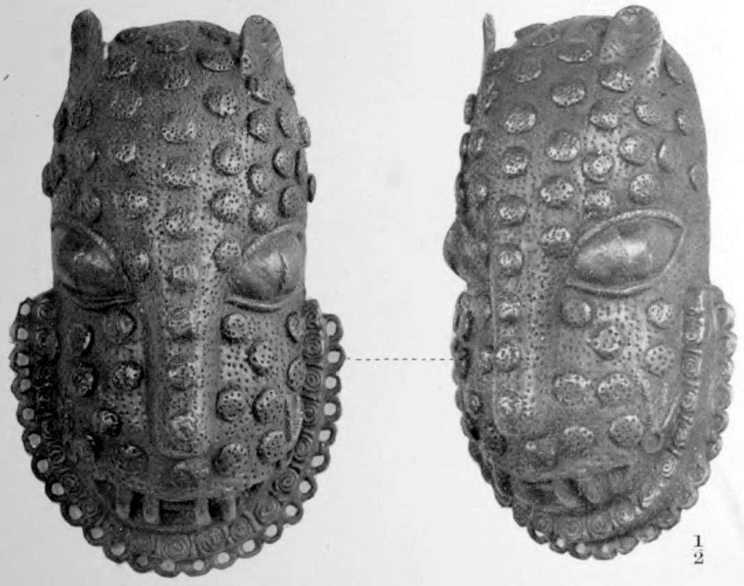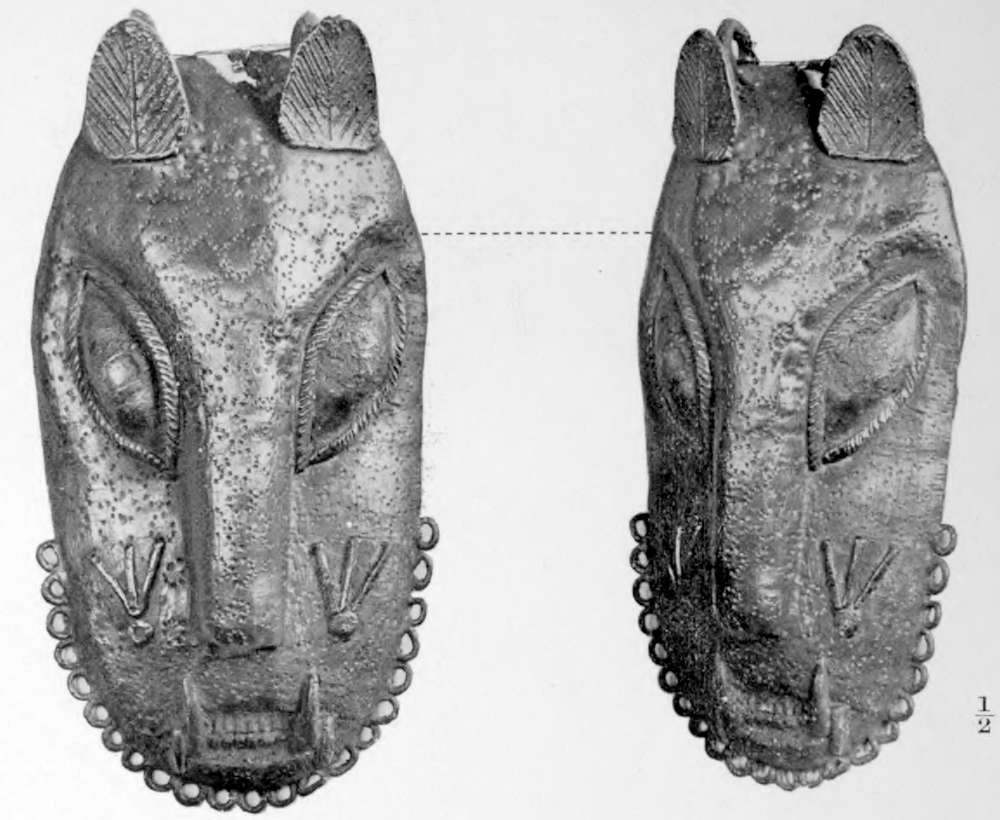 Figs. 60 and 61.—Leopard’s mask head of brass, the pupils of the eyes represented by bands. A barbed figure on each cheek. Eyelets along the edges, perhaps to receive crotals as in Figs. 58 and 59.