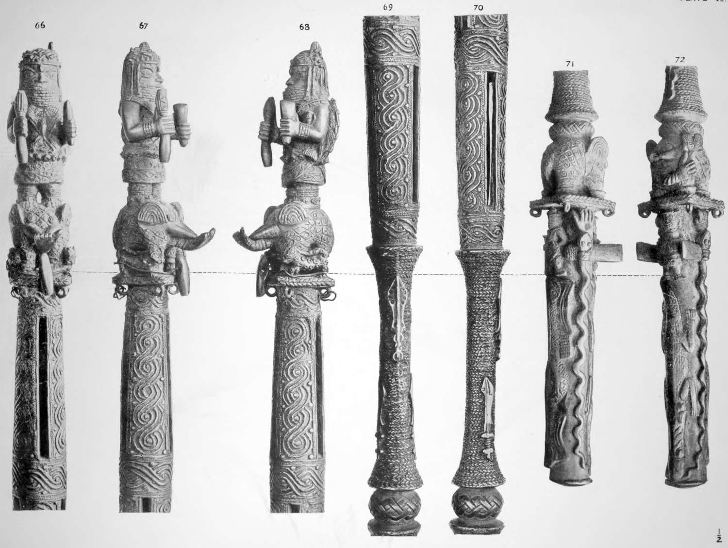 Figs. 356 and 357.—Bronze staff, surmounted by a vulture holding something in its beak, as in Figs. 286 to 288, Plate XXXVII; Fig. 271, Plate XXXV, and Figs. 354 and 355, Plate XLV. In Fig. 139, Plate XXIII, and in “Antiquities from Benin in the British Museum,” Plate XXIX, Fig. 3, figures are shown holding these staves and striking them with rods.