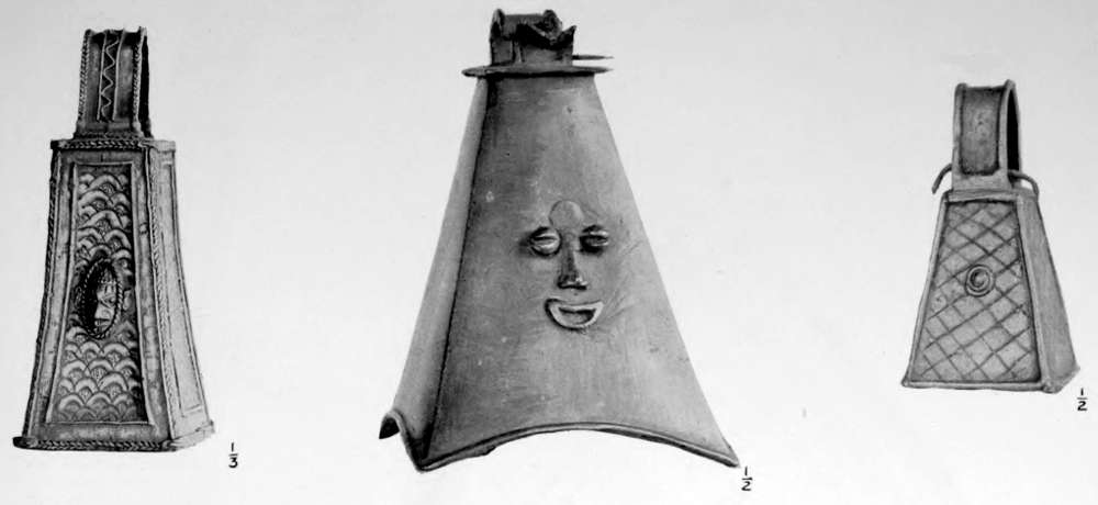 Figs. 73 to 75.—Three triangular brass bells. Fig. 73 has a negro head in relief on the front and fish-scale pattern.