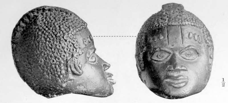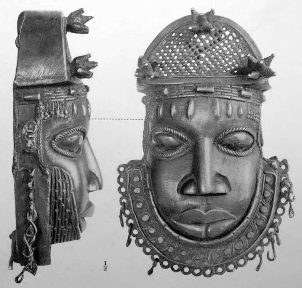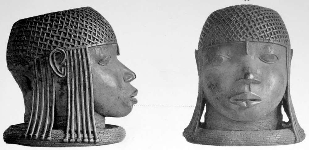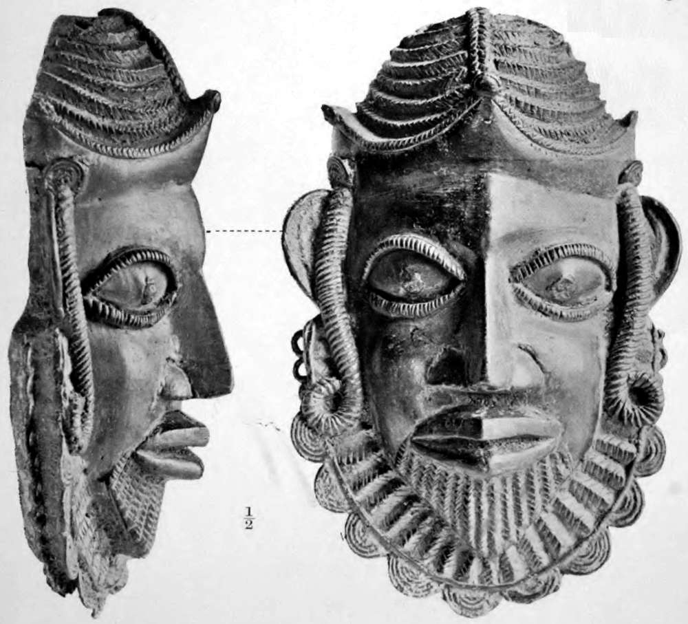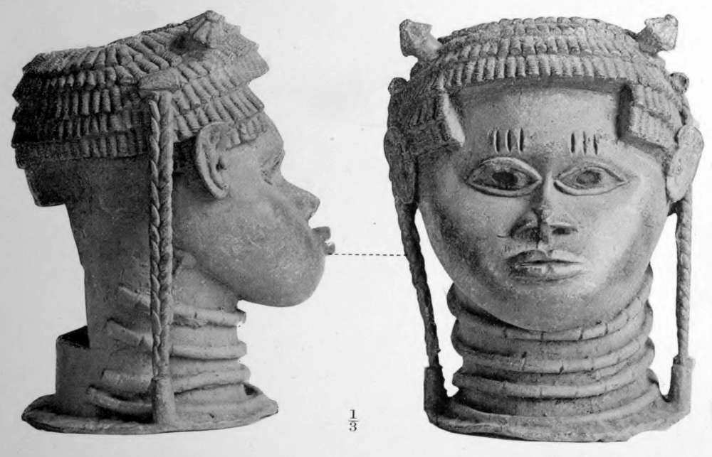 Figs. 94 and 95.—Bronze cast of human head. Negro features. Three tribal marks over each eye. Pupils of eyes inlaid with iron. Reticulated head-dress and rosettes of coral or agate, similar to that represented in Plate XXI, Fig. 121. Coral choker, badge of rank. Twelve bands of coral and a band apparently of plaited hair hanging from head-dress on each side.