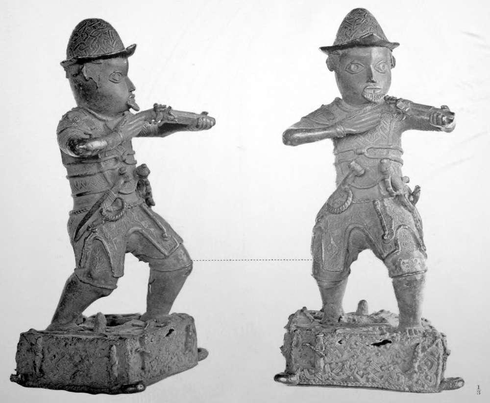 Fig. 361.—Bronze plaque, representing a figure, seated, holding apparently a hand-cannon in both hands, the butt of which is curved down. The dress has buttons on one side, as in the previous figure, and is surmounted by a vandyke ornamented collar of European type. Belt and pleated kilt. Face, apparently European, aquiline nose. European helmet. European sword with guard on right side.