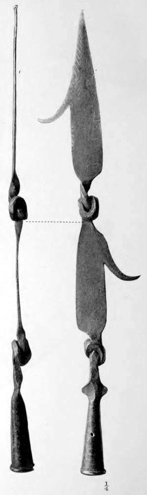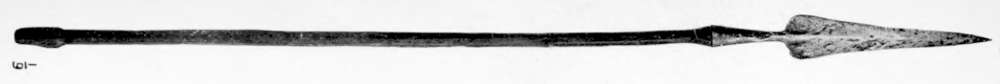 Fig. 104.—Iron dart, 3 feet 7¼ inches long, with barbed head and iron shaft.