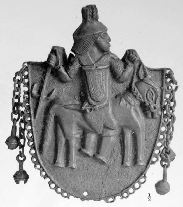 Fig. 112.—Bronze ægis, representing man on horseback to left, wearing single-edged sword with guard. A ranseur of the sixteenth or seventeenth century in right hand, point down. The hair is straight and combed out, and may probably represent a white man. The chain bridle is held up in left hand. Small crotals with chains hang from the eyelets on the edge of the ægis. Pattern of fish-scales on ground similar to that on the brass bell, Fig. 73, Plate XII, and elsewhere.