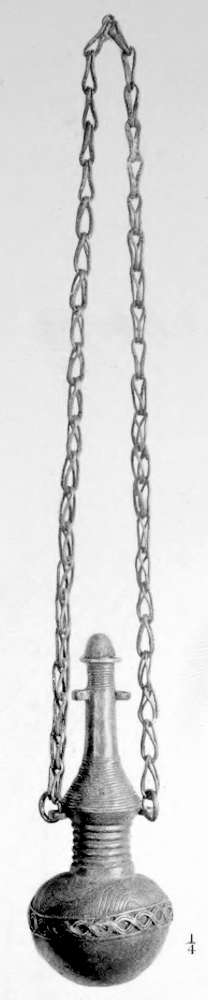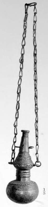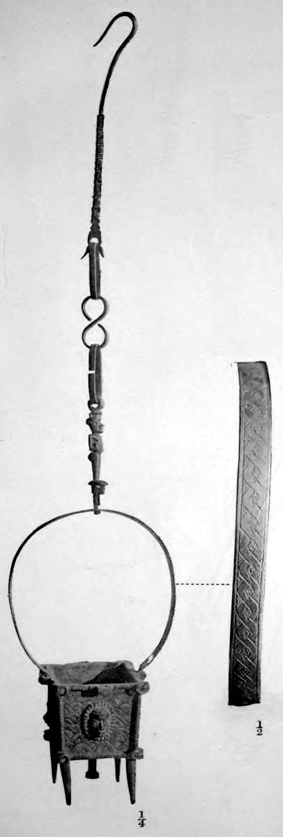 Figs. 382 and 383.—Cubical metal lamp, with handle, chain and hook for suspension. The hook is ornamented at its lower half with raised transverse incised lines and lozenge-shaped incisions. It is attached to a chain of three links, the upper and lower ones being oval; the middle one is 8-shaped. The other end of the chain is attached to a loop which projects from the head of a nude human figure (length of figure is 2½ inches), the feet of which are fixed by a loop of copper wire to the handle of the bar; the handle has a zigzag guilloche pattern on the upper side. There is a human face in relief on the sides of the body of the lamp, with fish-scale pattern on the groundwork. The borders of the lamp are raised rope pattern, and have a double loop knot at each corner. The lamp has four legs, and from the centre of the bottom is a small round piece projecting, and not so long as the legs. It is capped with a circular bottom, which is decorated with incised concentric circles. Height from top of hook when suspended is 26 inches.