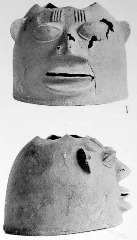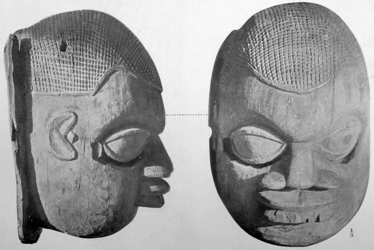 Figs. 25 and 26.—Ivory carving of a human face. Eyes and bands on forehead inlaid. Straight line diaper pattern on head-dress, above which are conventionalised mud-fish. Four bands of coral across forehead. Ears long and narrow. Found hidden in an oaken chest inside the sleeping apartment of King Duboar.