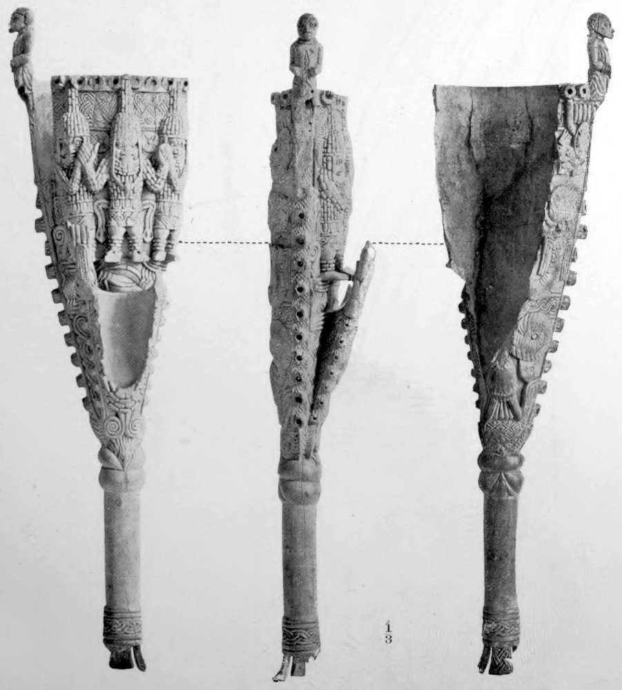 Figs. 320 and 321.—Wooden bird resembling a turkey. The inlaying of the eyes has disappeared; the feathers are conventionally represented by carved squares and lines of herring-bone pattern. On the top is a rudely-cut vertical projection 5 inches high and 2½ inches broad, the meaning of which is unknown; and from it hangs on each side of the bird, a broad band 3½ inches broad, carved with four rows of herring-bone pattern, the meaning of which is also unknown. The front of the base is ornamented with a guilloche pattern of four strands.