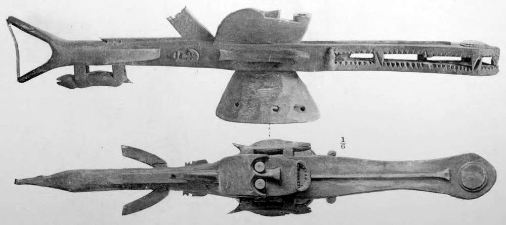 Fig. 330.—Iron staff, similar to the bronze one, Figs. 354 and 355, Plate XLV. In the cluster at the top is the figure of a bird surmounting an animal, probably a chameleon, similar to the one half-way down the stem, and surrounded by a cluster of various implements and weapons, points upwards, amongst which may be distinguished a fork with diamond-shaped heads, a curved bill-hook, a chisel, a spud and a reaping-hook. Below this are two clusters each of six hanging bells; two sinuous snakes, heads upwards, are crawling up the stem.