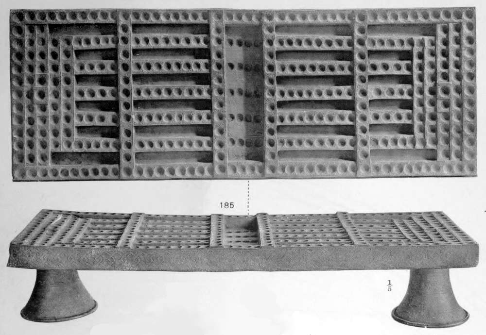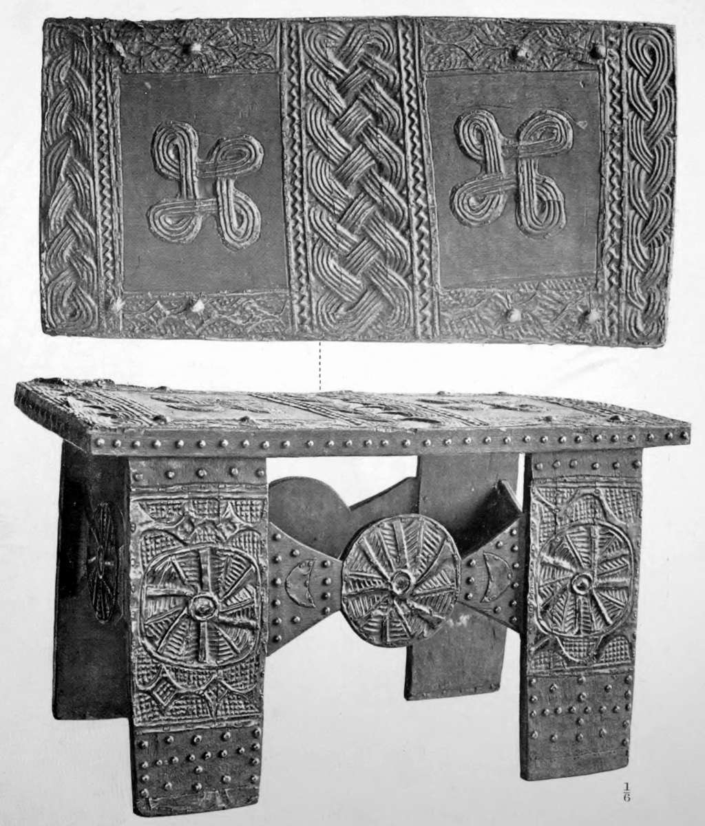Figs. 318 and 319.—Wooden seat, of oblong form, supported by four legs, with cross-braces. All the ornamental portions are plated with thin brass, beaten on and riveted. The top of the seat is ornamented in the centre and ends by bands of single and double guilloche pattern, and in the centre of the squares by a square pattern of interlaced strands riveted on, similar to that represented on the blade of the sword, Fig. 199, Plate XXVIII. The legs and sides of the seat are ornamented by wheel-shaped forms, in eight places, and half-moons, similar to those on the ground-work of the plaque, Fig. 180, Plate XXVII. The stool in various parts is ornamented by brass-headed nails, which might perhaps be European.