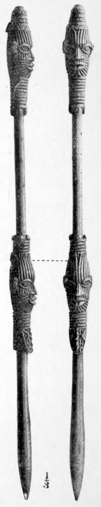 Fig. 362.—Iron axe, in carved wooden handle and shaft; with six wooden human faces, the pupils of the eyes inlaid with lead.
