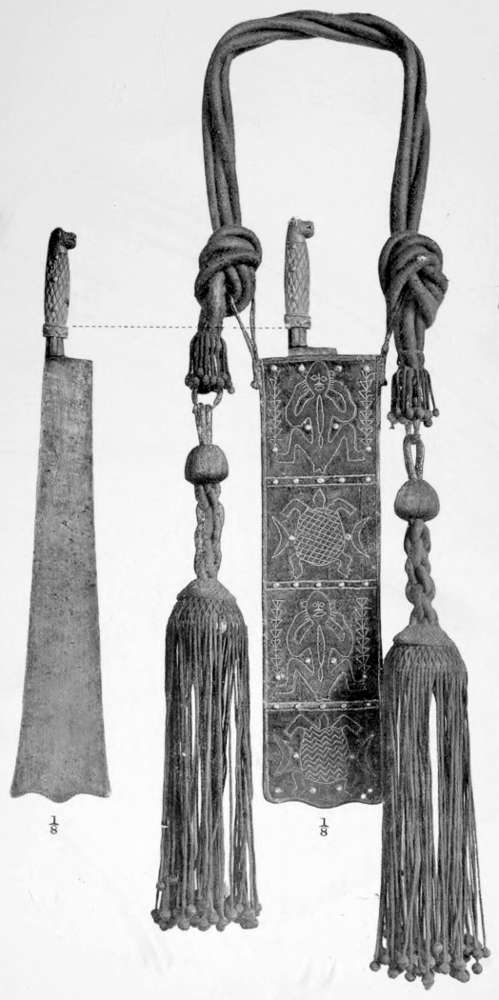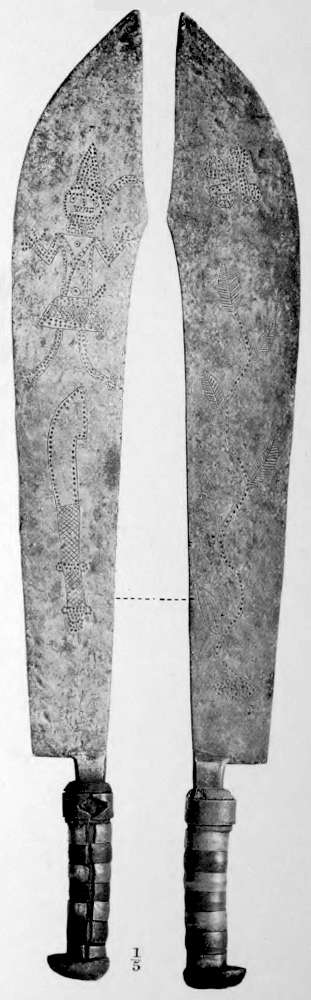 Fig. 110.—Iron execution sword, 3 feet 1 inch long, hilt and pommel of brass, with copper inlaid ornamentation. The grip bound with brass wire. It is single-edged, the edge being on the convex side. It resembles the swords engraved on the circular shield, Fig. 102, one on each side of the broad leaf-shaped sword. This kind of sword is held in the hands of warriors on two plaques in this collection, Fig. 254, Plate XXXIII, and Fig. 291, Plate XXXVIII. It is also seen on the carved cocoa-nut, Fig. 220, Plate XXX, and elsewhere. It is rudely forged.