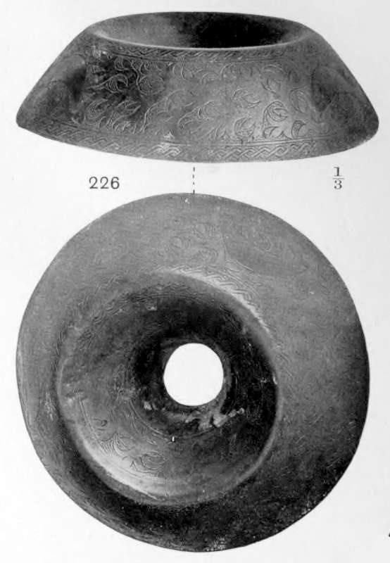 Fig. 387.—Cast metal bowl. The small opening at the top is situated in the centre of an incised rosette; this, together with four similar but smaller rosettes, are coated with a copper wash. On the base is a rosette within a circle.