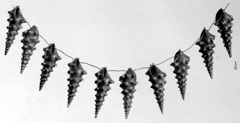 Fig. 384.—Metal armlet, ornamented with five rows of inlaid copper conventionalized cat-fishes and human faces; the latter have long hair, long whiskers, and long noses. Height, 5⅞ inches.