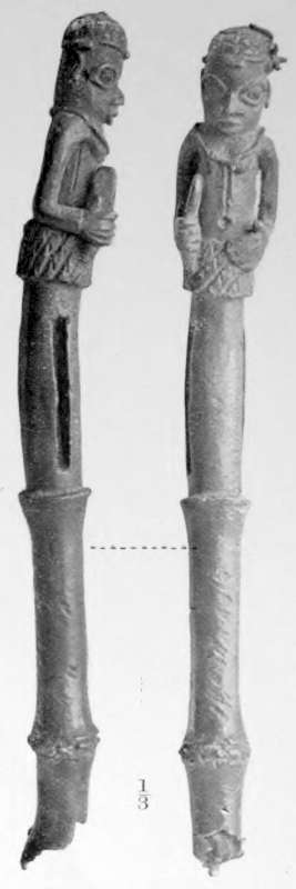 Figs. 352 and 353.—Bronze staff, probably intended to be held in the middle. Ornamented at both ends with human figures back to back. The stem ornamented with loops as in Figs. 208 and 209, Plate XXIX.