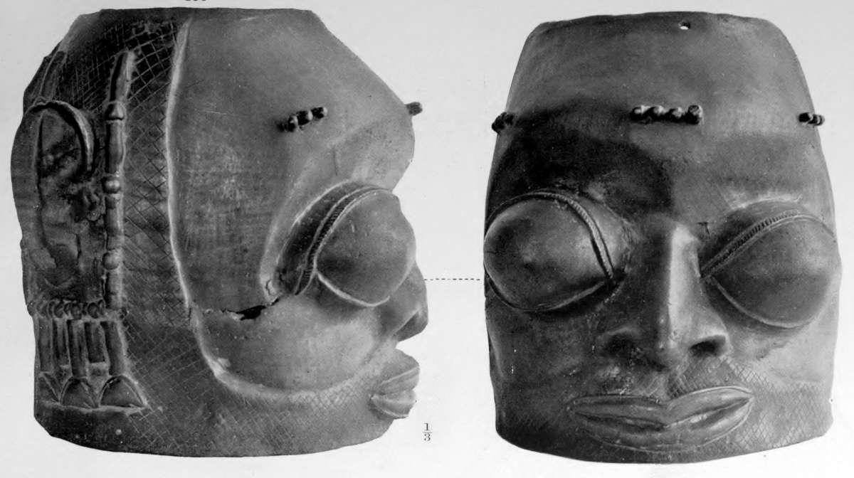 Figs. 98 and 99.—Well-formed head in bronze, the forehead decorated with two inlaid bands and four raised cicatrices (tribal marks) over each eye. The pupils of the eyes inlaid apparently with iron, coral necklace, a badge of rank. The metal is very thin, being only 1 mm. in thickness. The hair in conventional bands of ridges; the ears unusually well formed.