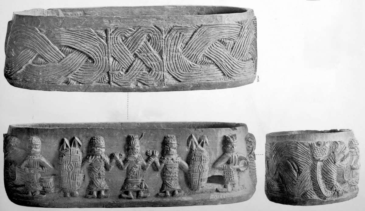 Figs. 64 and 65.—Bronze vase. The design appears to be purely native. It is ornamented with four human masks, two of which are ribbed. There are two elephants’ heads with tusks, but no trunks over each ribbed head. Four bands of plain guilloche pattern arranged vertically between the heads. Concentric circles. Thickness of metal on unornamented parts, 2 mm.