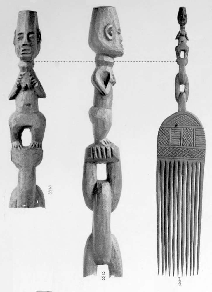 Figs. 392 and 393.—Carved wooden head, which may have been a mask. Represents the head of a negro; it is hollow, and may have been intended for a mask, as there are open slits underneath each eye. The hair is represented by incised reticulated lines. The three black lines over the eyes represent cicatrices. The lower part of the face is rounded, and the chin not marked. Height, 13 inches.