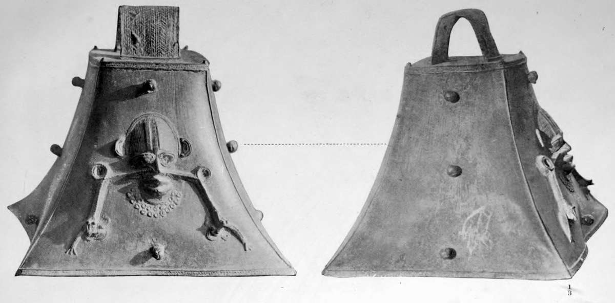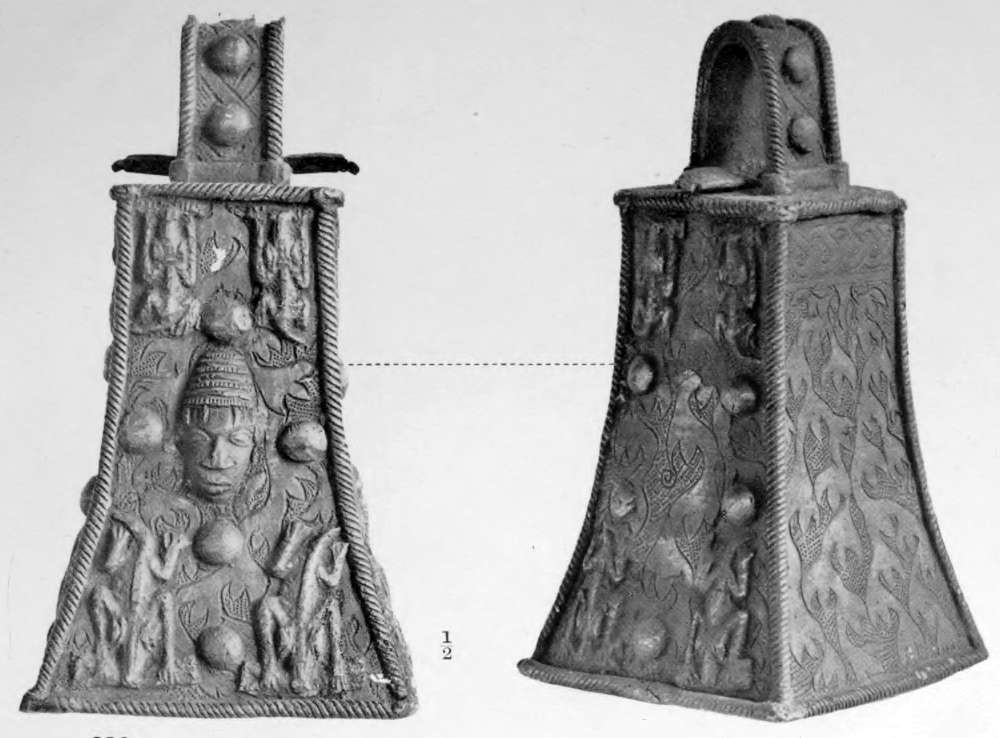 Figs. 390 and 391.—Large metal bell. On one side is a human face in relief, with snakes issuing from the nostrils. Each of the two snakes grasps a mud or cat fish in its jaws. The ears project from the sides of the head-dress, and the neck has a frill consisting of a double row of perforated circles. The handle has an incised herring-bone ornamentation. Projecting from the sides of the bell are eight knobs. The base and crown of the bell have a border of strap-work pattern. Height of bell, 10 inches.