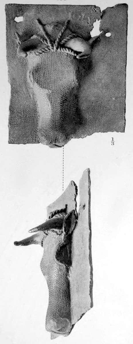 Fig. 17.—Bronze plaque, figure of warrior with spear in right hand, shield in left hand; pot helmet, button on top. Quadrangular bell hanging from neck. Coral choker, badge of rank. Leopards’ teeth necklace. Leopard’s skin dress with head to front. On the ground are two horses’ heads below and two rosettes above. Ground ornamented with the usual foil ornaments incised.