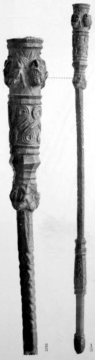 Figs. 22, 23 and 24.—Ivory carving of figure on horse, with spear in right hand and bell on neck, and long hair. The bridle formed as a head-collar. Degenerate guilloche pattern on base. The stand formed as a socket for a pole ornamented with bands of interlaced pattern and the head of an animal.