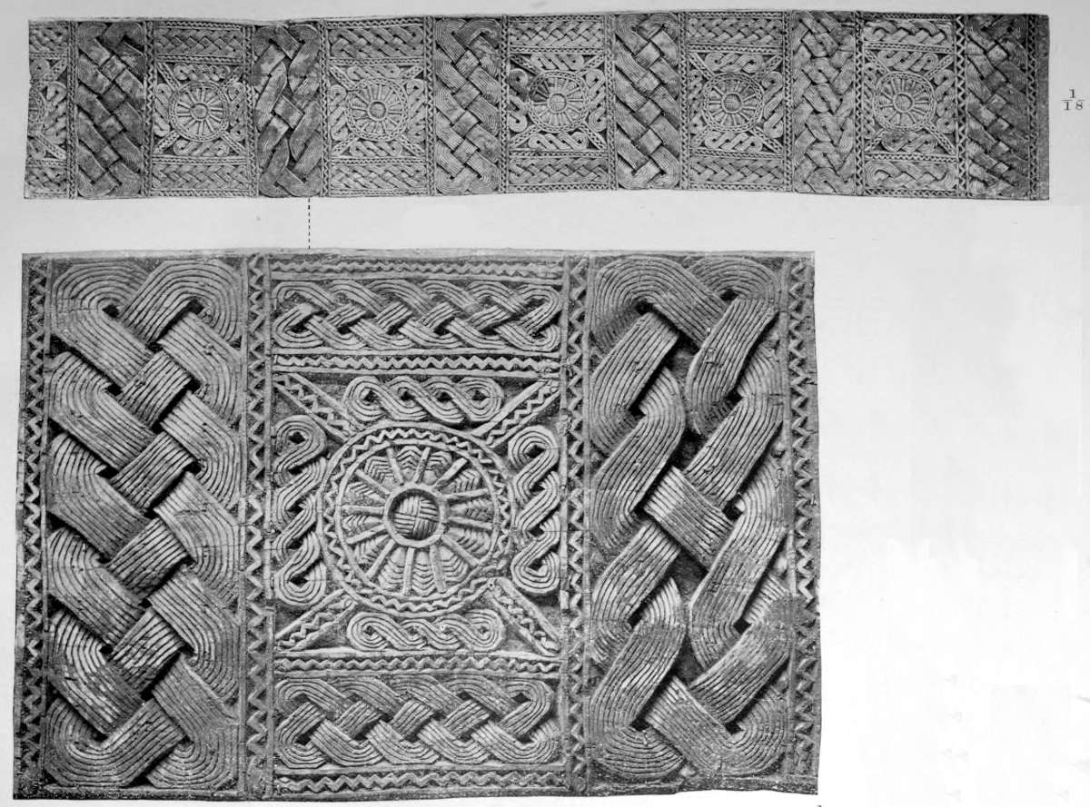 Fig. 317.—Wooden plaque, ornamented in the centre by a coil of interlaced strap-work, bounded by two lines of zigzag pattern. On one side a broad leaf-shaped sword with a ring pommel, similar to Figs. 326 and 327, Plate XLII, and Figs. 328 and 329, Plate XLIII. The handle is ornamented with a straight line diaper pattern. On the other side is represented an execution sword, similar to Fig. 110, Plate XVIII.