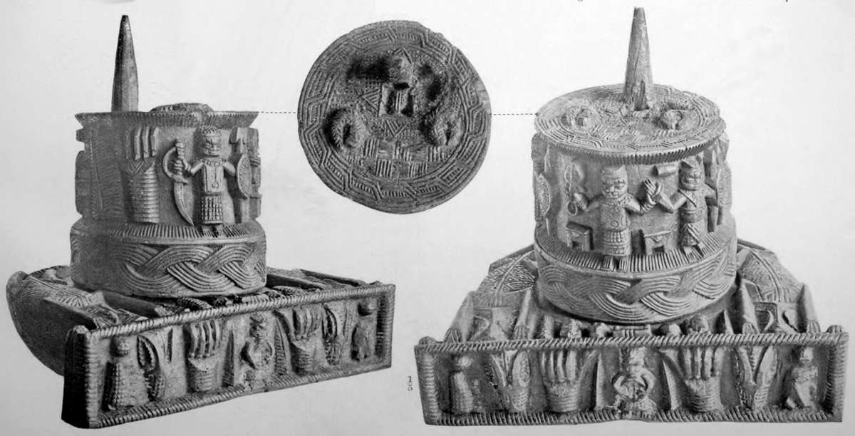 Figs. 333 to 335.—Round execution block and stand of wood, elaborately carved with figures of men and animals. On the top is a pointed spike of wood, 5 inches in height, on which the head of the victim appears to have rested, and below this on the surface at the top of the block are two receptacles for the thumbs of the victim, in the form of coiled mud-fish. The ornamentation on the top consists of squares and triangles filled with parallel straight lines alternating in direction, and edged with a circle of broken guilloche pattern. On the sides are three human figures, two of which are holding hands upwards, weapons and shields, and one a curved sword of European form, point downwards. Between these figures are two boxes or stools; there are also two human hands and other objects on the other side. The bottom of the block is surrounded by a broad guilloche pattern of four or five strands. The stand on which the block stands is of semicircular form. The top is ornamented with two animals, resembling crocodiles, conforming to the outline of the curve, and other animals and objects. On the front of this stand is a row of objects, consisting, in the centre, of a human figure holding something on the abdomen, human hands, animals’ heads, and other objects. A very similar execution block, but without stand, is shown in Figs. 258 to 260, Plate XXXIV. The barbarous carving and ornamentation of such gruesome objects is quite characteristic of Benin art.