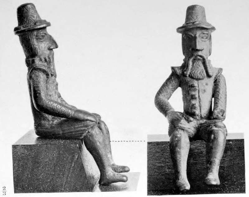 Figs. 358 and 359.—Bronze seated figure, apparently of an European. The dress has large buttons on one side. The hat, with brim, is ornamented with chevrons filled with parallel straight lines; the moustache very long; the nose aquiline and very large; the shoulders guarded by “wings.” Left hand and forearm broken.