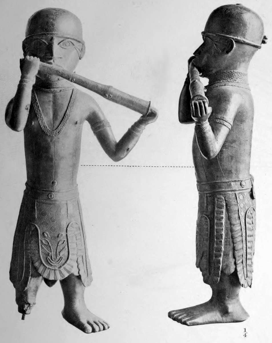 Figs. 374 and 375.—Bronze statuette of a musician in the act of playing a wind instrument. He wears a pot hat, a collar, and loose necklet hanging down over the chest, also armlets and wristlets. He wears a decorated loin cloth, with a border representing a row of feathers, and in the centre of the garment is a conventional leopard’s face. Height of statuette is 24½ inches.