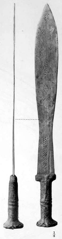 Fig. 105.—Iron dagger, or short sword, length 16¼ inches; the incised ornamentation is on alternate sides, like those of the Gaboon and other parts of Africa. There are also sinuous lines engraved on alternate sides. It is rudely forged, and the handle is very small and bound with strips of copper.