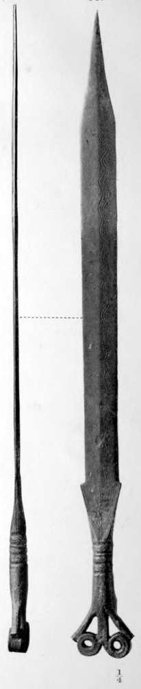 Figs. 328 and 329.—Broad leaf-shaped iron sword, similar to Figs. 326 and 327, Plate XLII. The handle enclosed in a large ring of metal, 8 inches by 5½ inches interior measurement, twisted in two places. It has probably had a grip of wood, which has disappeared. The blade, which is only ·06 inch in thickness, is ornamented with a pattern of perforated holes. The use of this instrument is unknown; it may have been an execution sword, but, if so, the ring-guard appears superfluous.