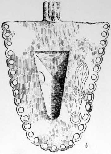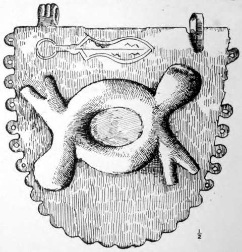 Fig. 111.—Bronze ægis, representing a chief standing with attendants holding up his hands in a manner similar to Figs. 76-78, Plate XII, and Figs. 167 and 168, Plate XXVIII. Frogs between the feet. Cylindrical spikes on head-dresses.